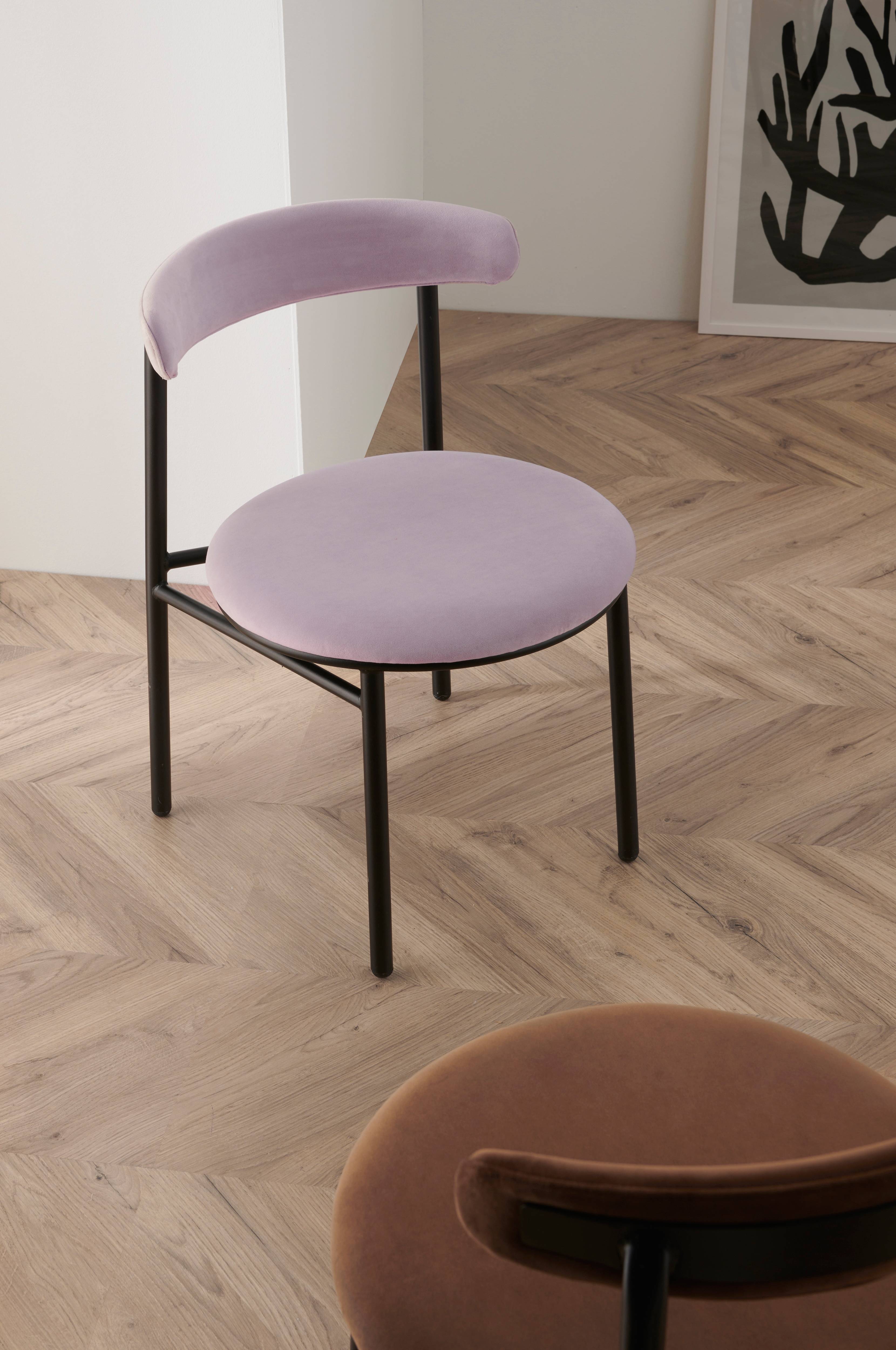 2 stole i moderne design med rundt sæde og svungen ryg. Stel og ben i metal. Sæde og ryg med skumpolstring. Lettere samling.