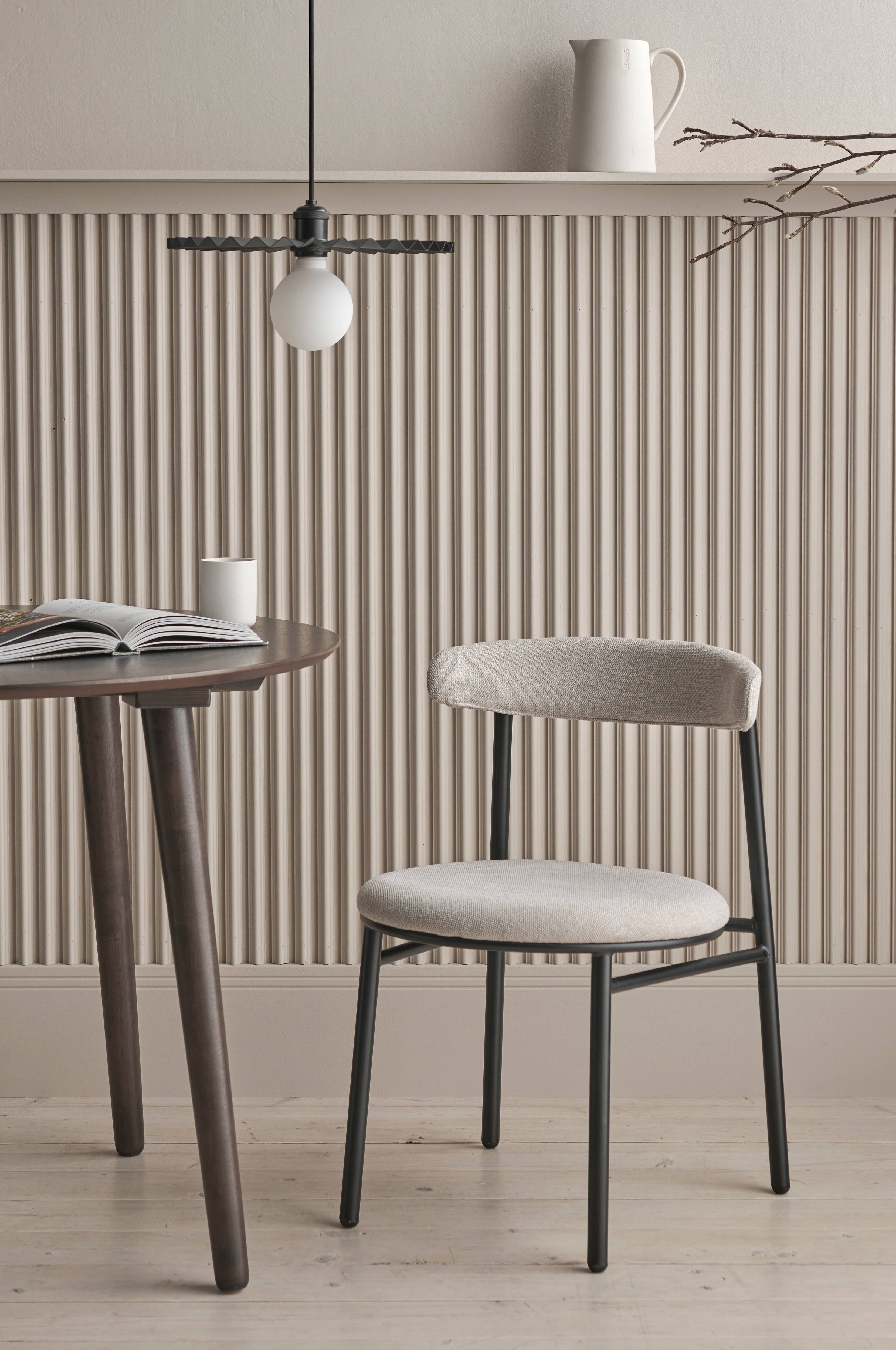 2 stole i moderne design med rundt sæde og svungen ryg. Stel og ben i metal. Sæde og ryg med skumpolstring. Lettere samling.