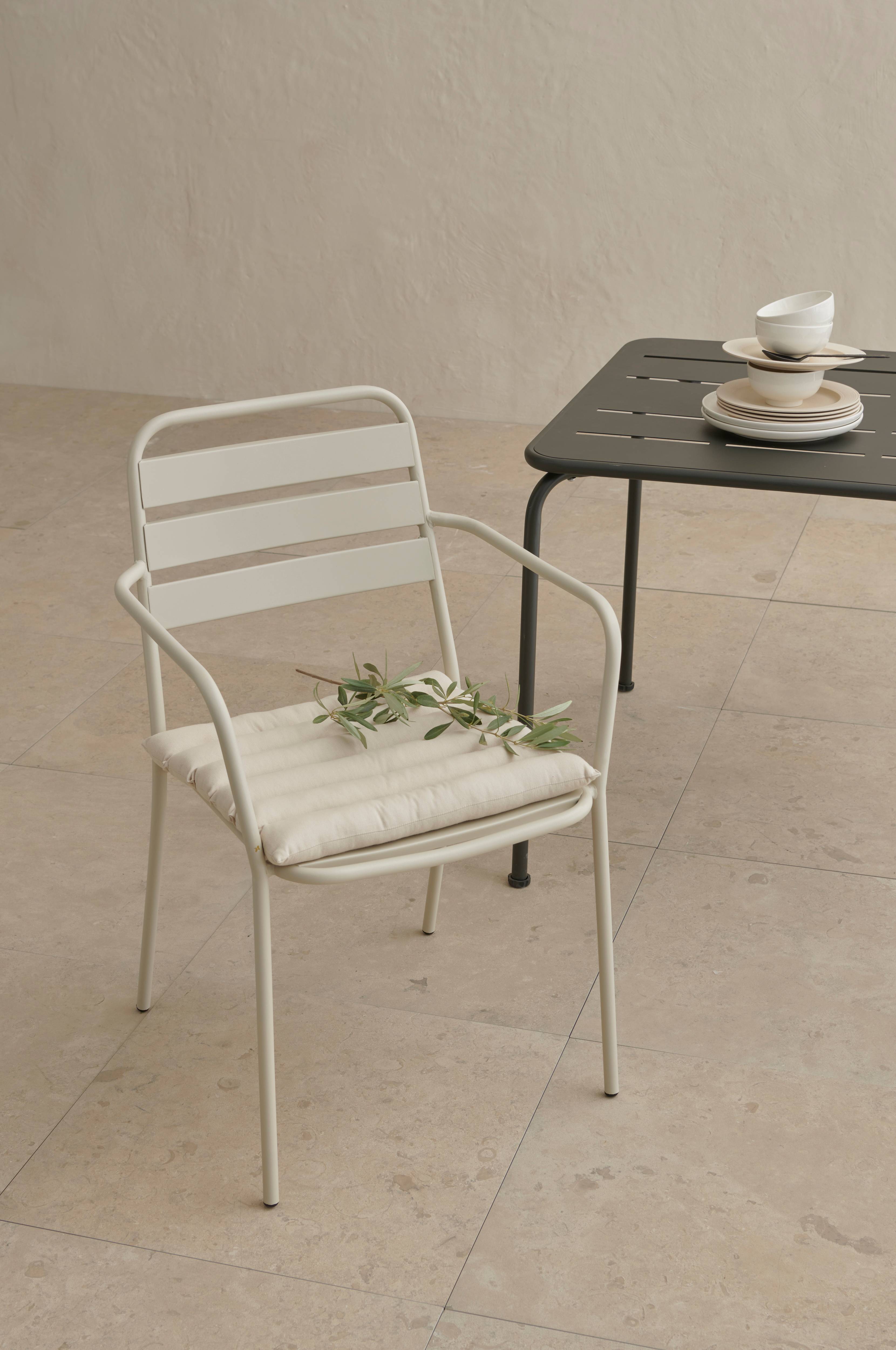 To stole med armlæn af pulverlakeret metal. Mål: Bredde 56 cm, højde 89,5 cm, dybde 59 cm. Siddehøjde 46 cm, siddedybde 41 cm. Højde fra gulv til armlæn 70 cm.Dette udemøbel skal opbevares tørt, køligt og frostfrit.