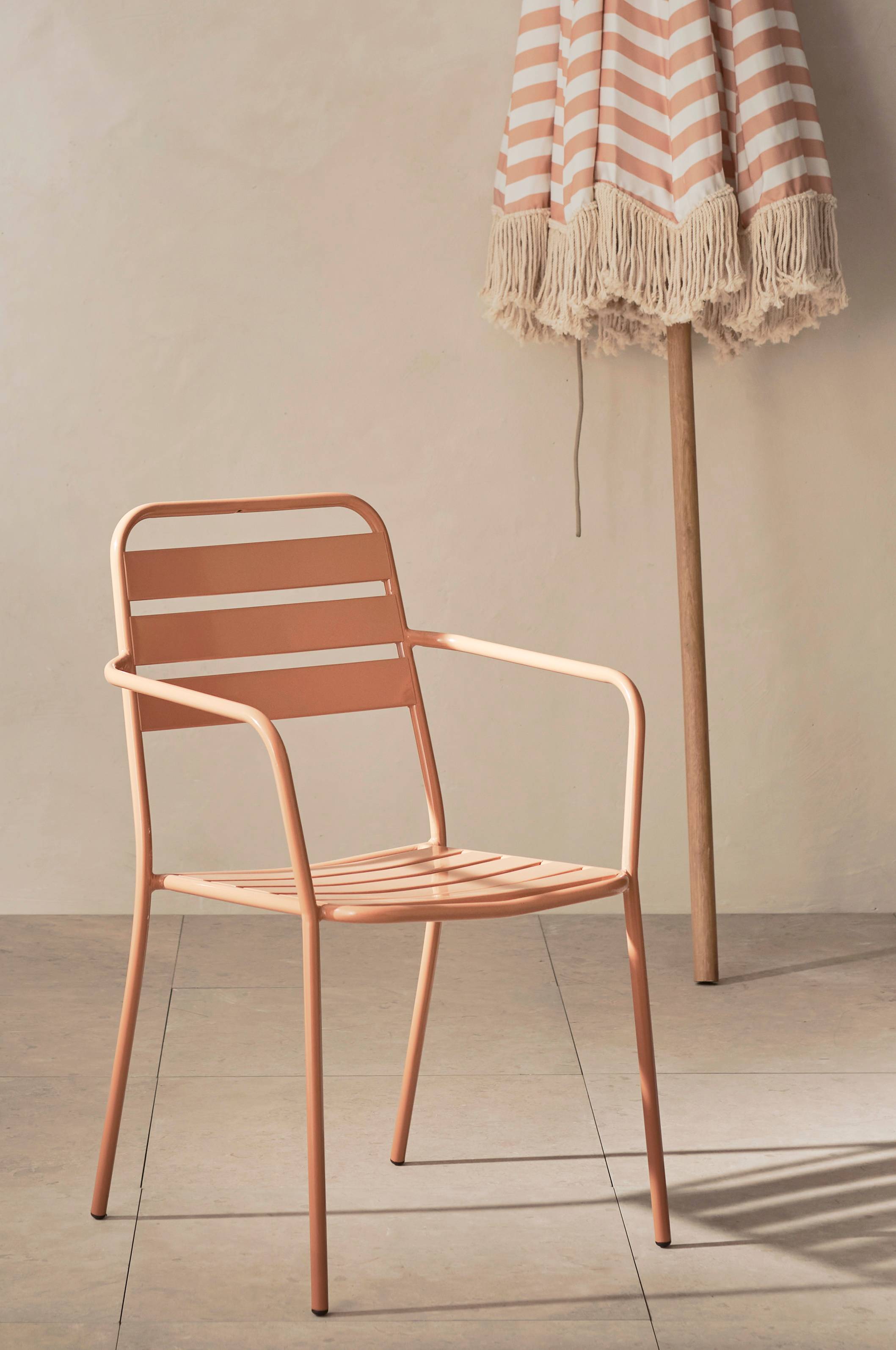 To stole med armlæn af pulverlakeret metal. Mål: Bredde 56 cm, højde 89,5 cm, dybde 59 cm. Siddehøjde 46 cm, siddedybde 41 cm. Højde fra gulv til armlæn 70 cm.Dette udemøbel skal opbevares tørt, køligt og frostfrit.