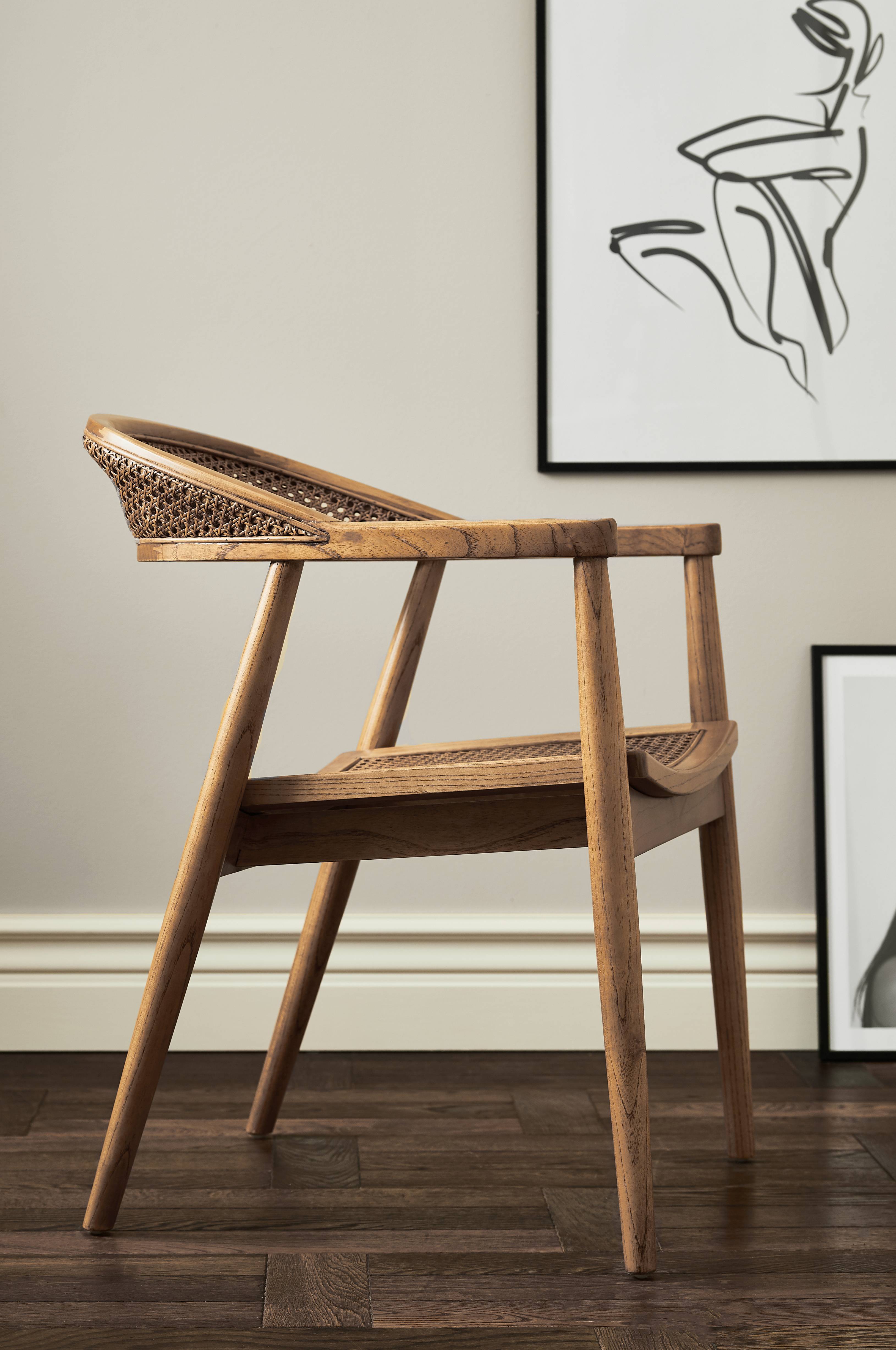 Stol med armlæn af elmetræ med sæde og ryg i dobbeltvævet rotting. Mål: Bredde 58 cm, højde 77 cm, dybde 60 cm. Siddehøjde 43 cm, siddedybde 43 cm, siddebredde 48 cm. Armlænets højde 66 cm.