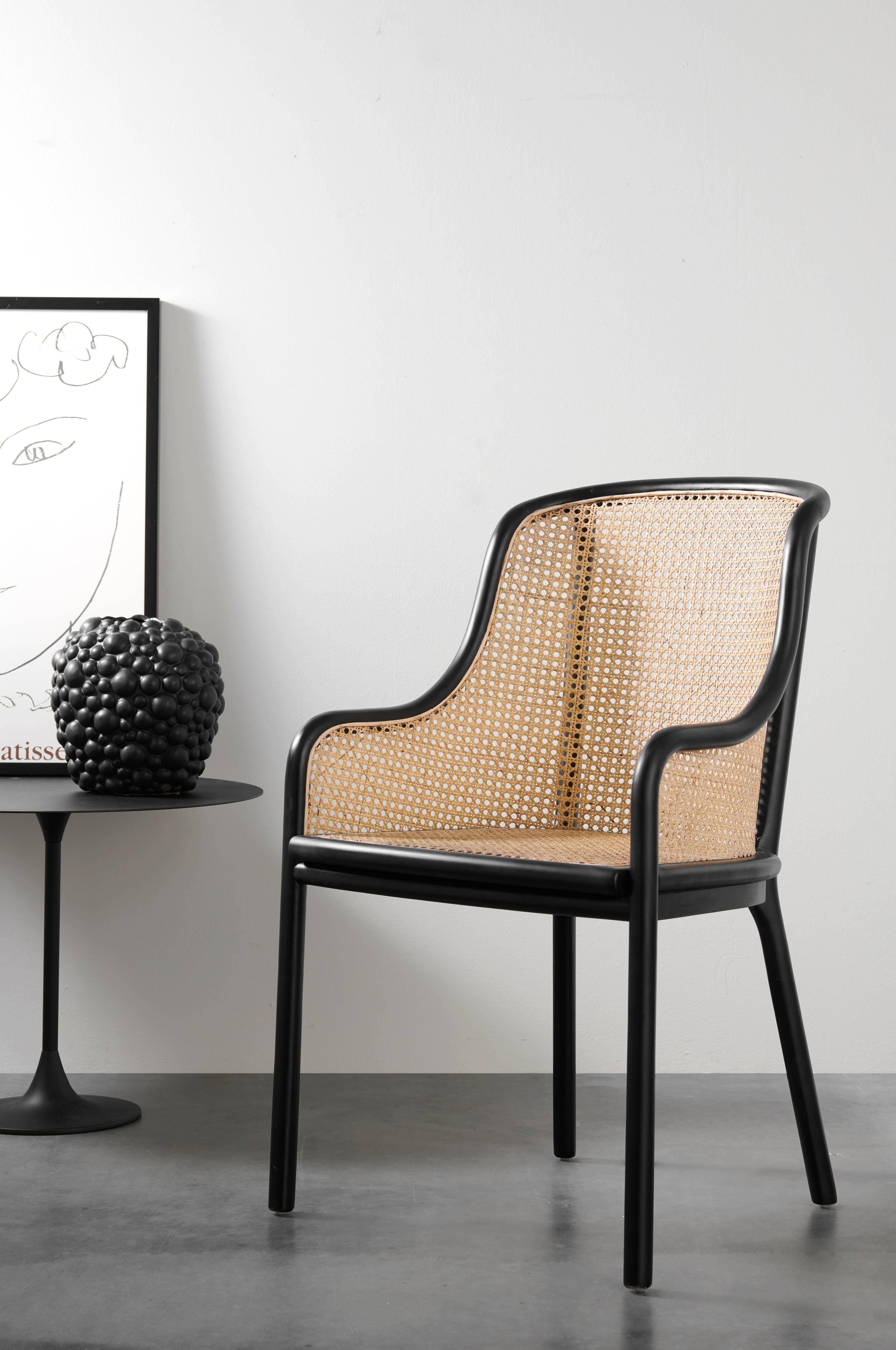 Elegant, høj stol med armlæn i klassisk model med bløde former. Af bøgetræ med sæde og ryg i rottingvæv. Mål: Bredde 58 cm, højde 91 cm, dybde 56 cm. Siddedybde 45 cm, siddehøjde 48 cm. Maksimal belastning 100 kg. Samlet.