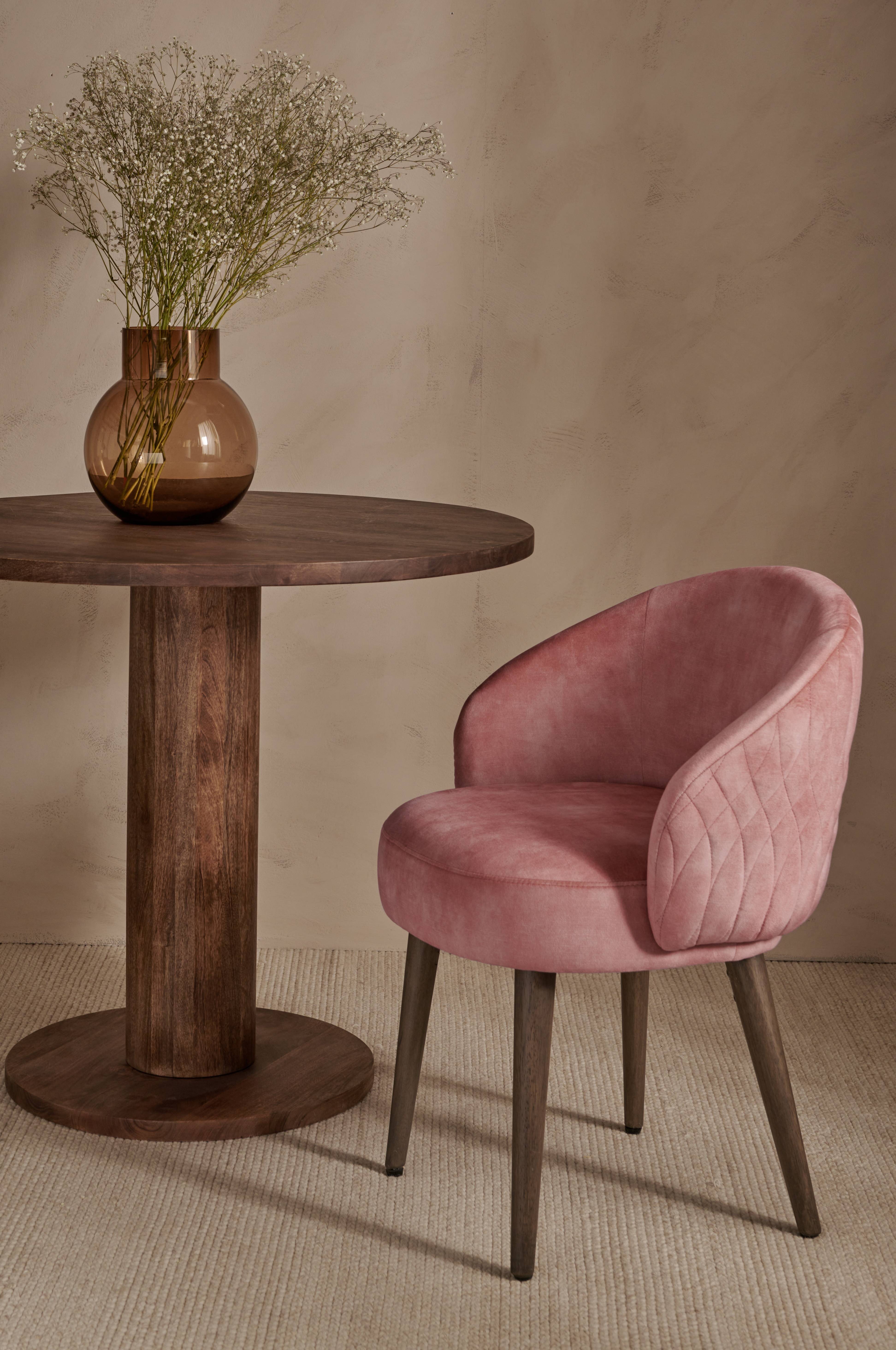 To stole med armlæn med ben og stel i gummitræ. Betræk i meleret velour med quiltet mønster på ydersiden af ryglænet. Skumpolstring. Lettere samling.