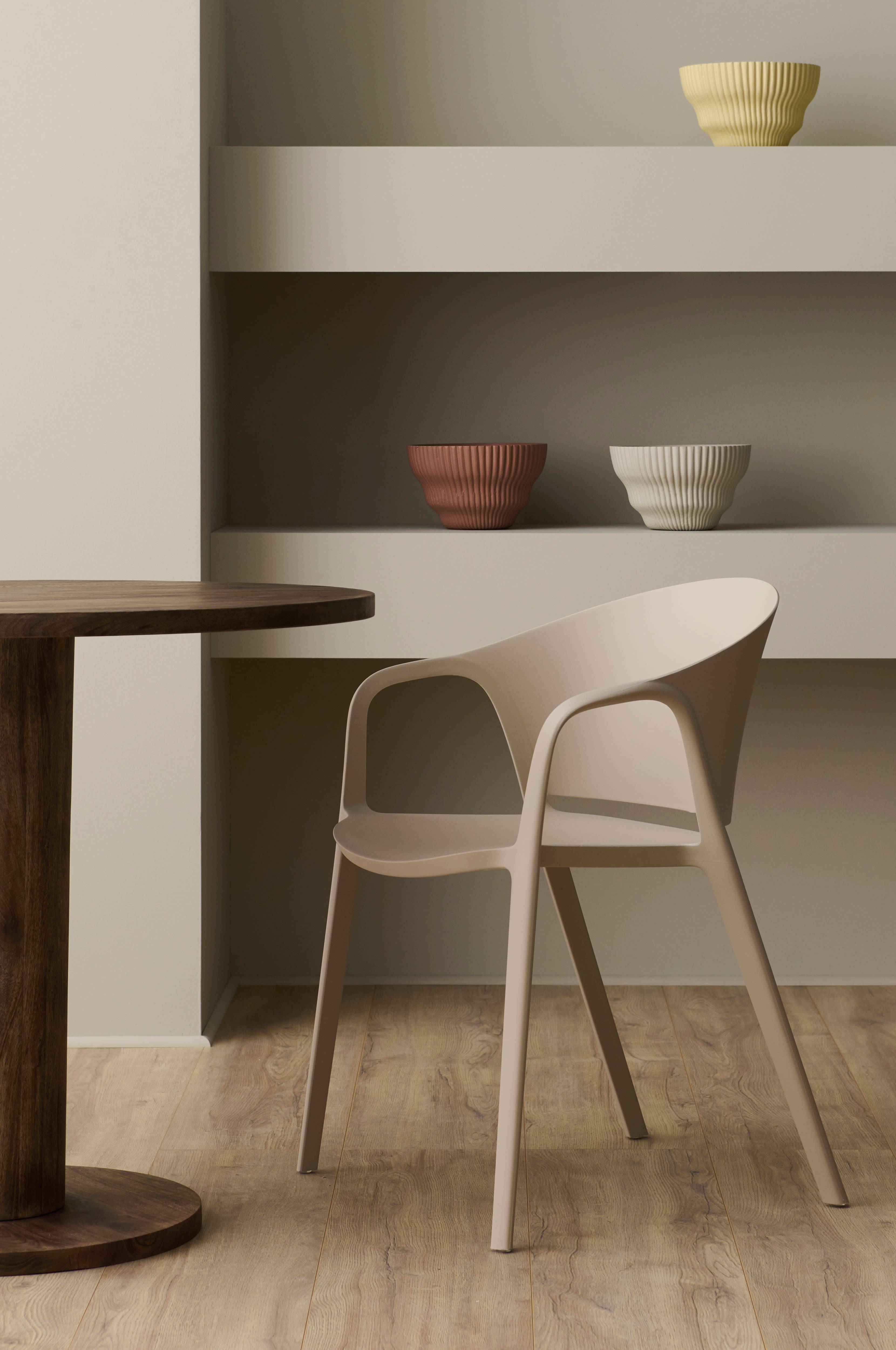 To stole med armlæn i PP-plast med afrundet form. Kan bruges både indendørs og udendørs.