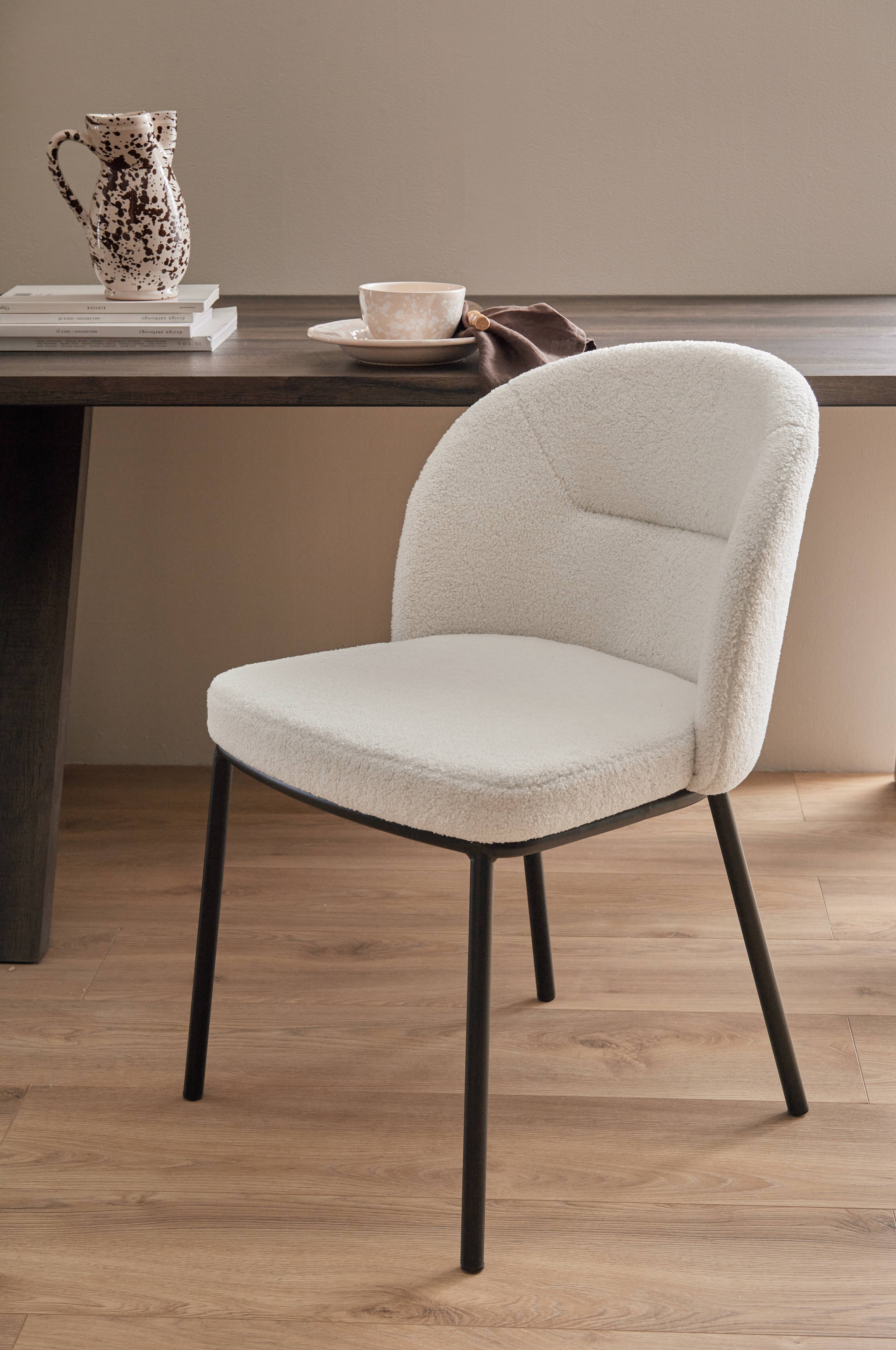 To stole med ben og stel i pulverlakeret metal. Betræk i plys med tæt, kort luv. Skumfyld. Maks. vægt 150 kg. Ryglæn højde 36 cm.
