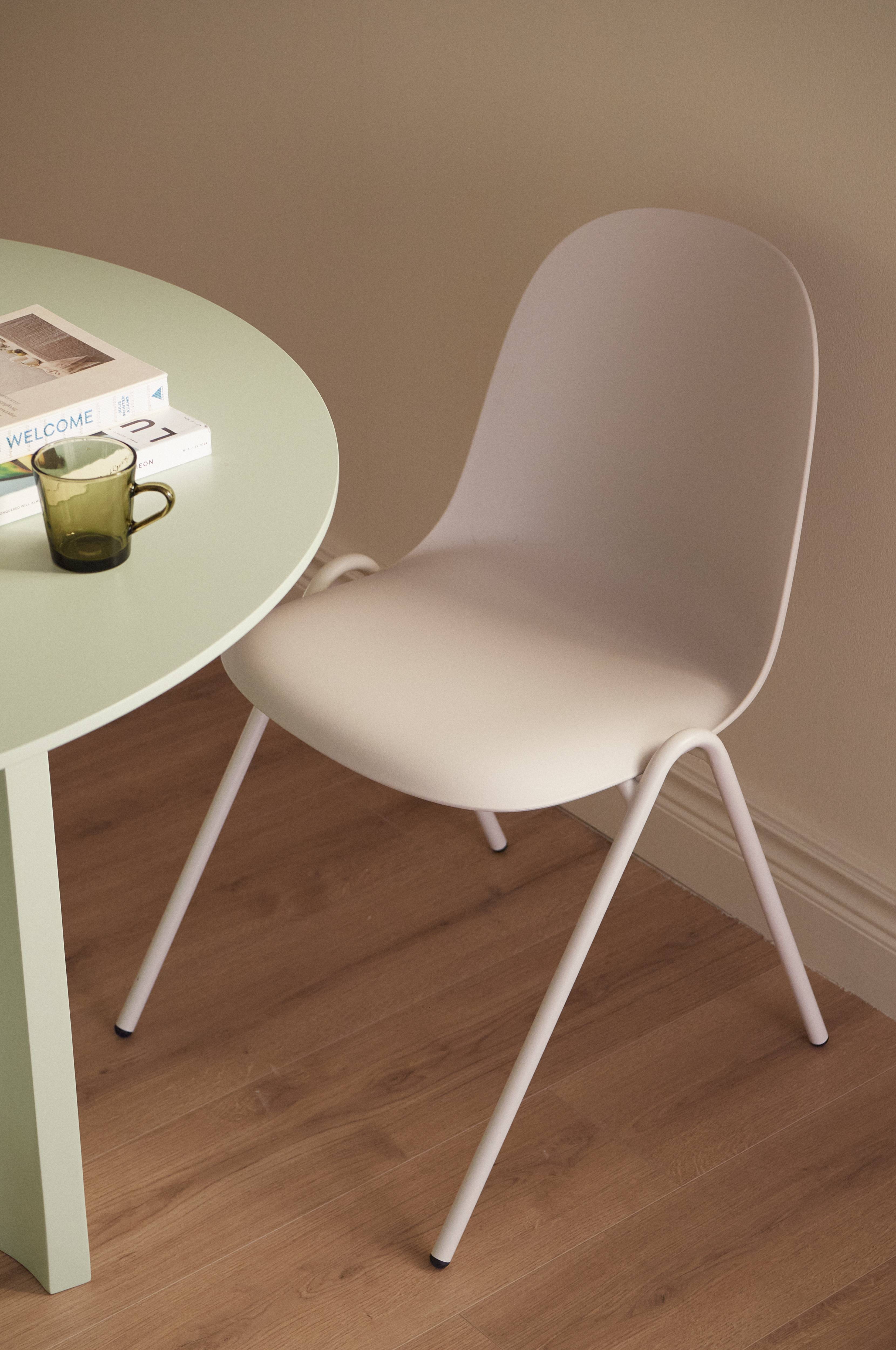 • To spisestole i letvægtsplast med en overflade, der er nem at tørre af• Ben i pulverlakeret, skinnende metal• Sædebredde: 42 cm