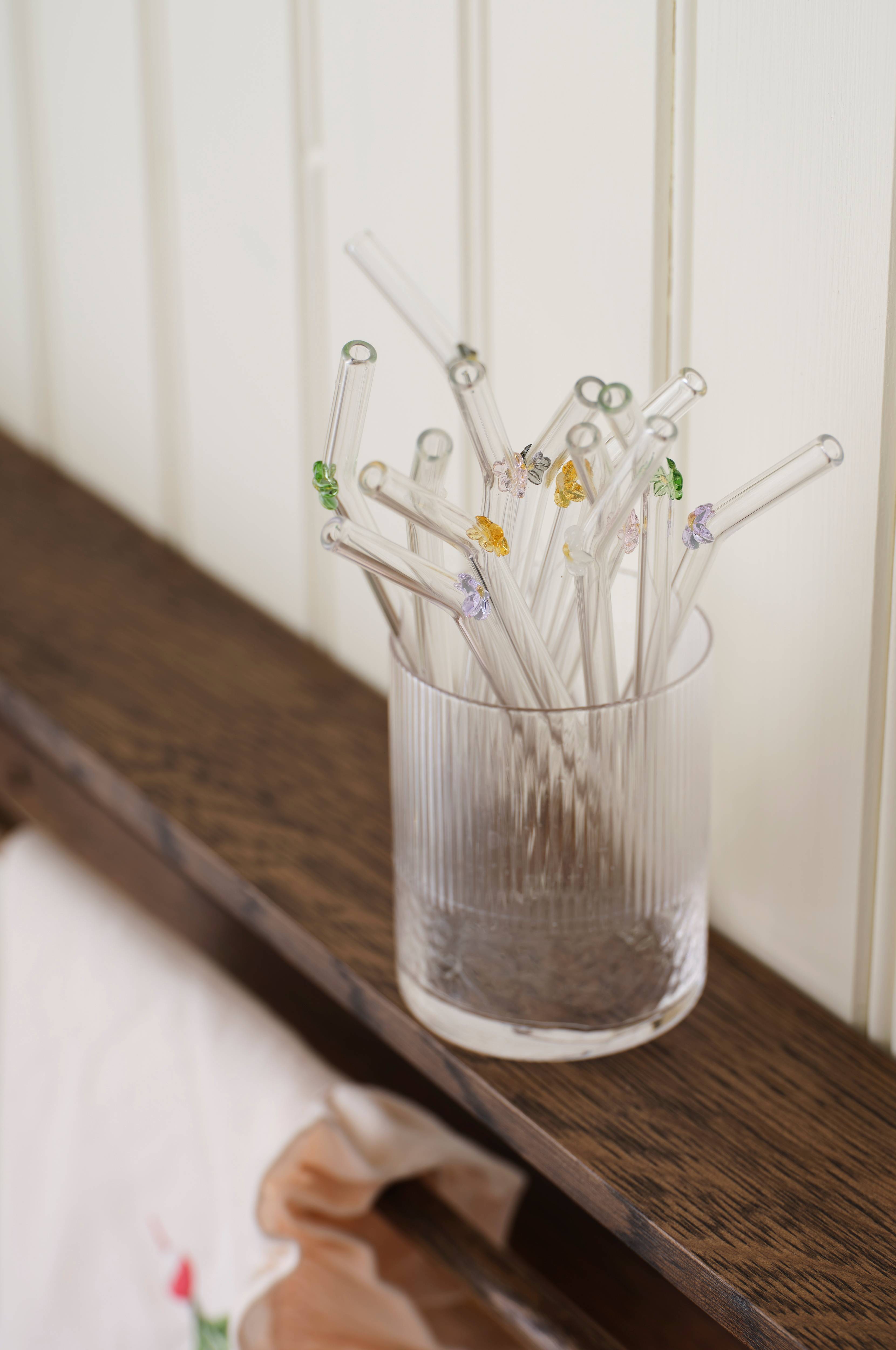 • Praktiske sugerør i glas med dekorative, farvede blomsterdetaljer på toppen