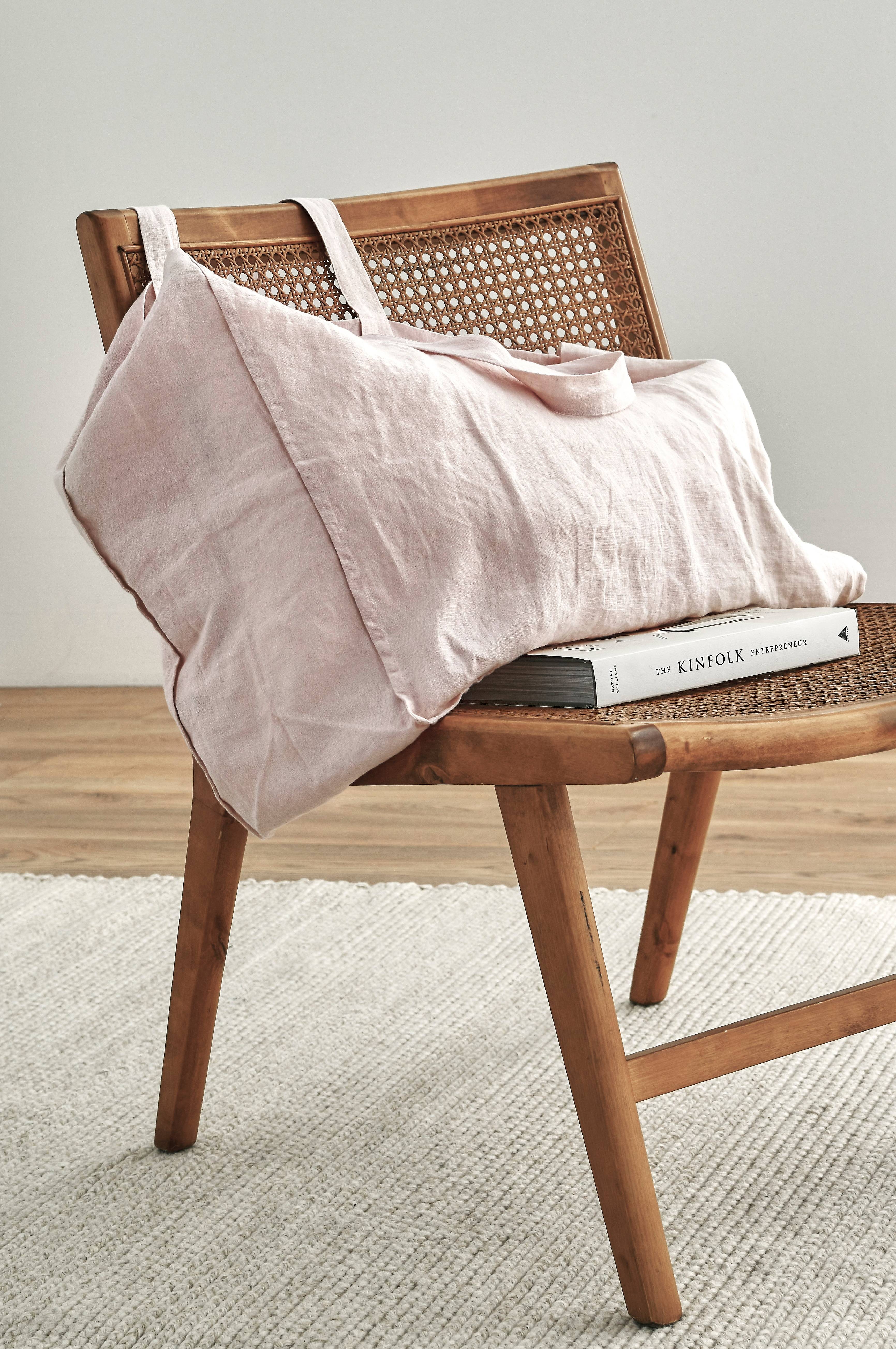 Stor åben taske af fransk hør i blød, vasket kvalitet. To bærehanke. Mål: B59 x H46 x D21 cm.