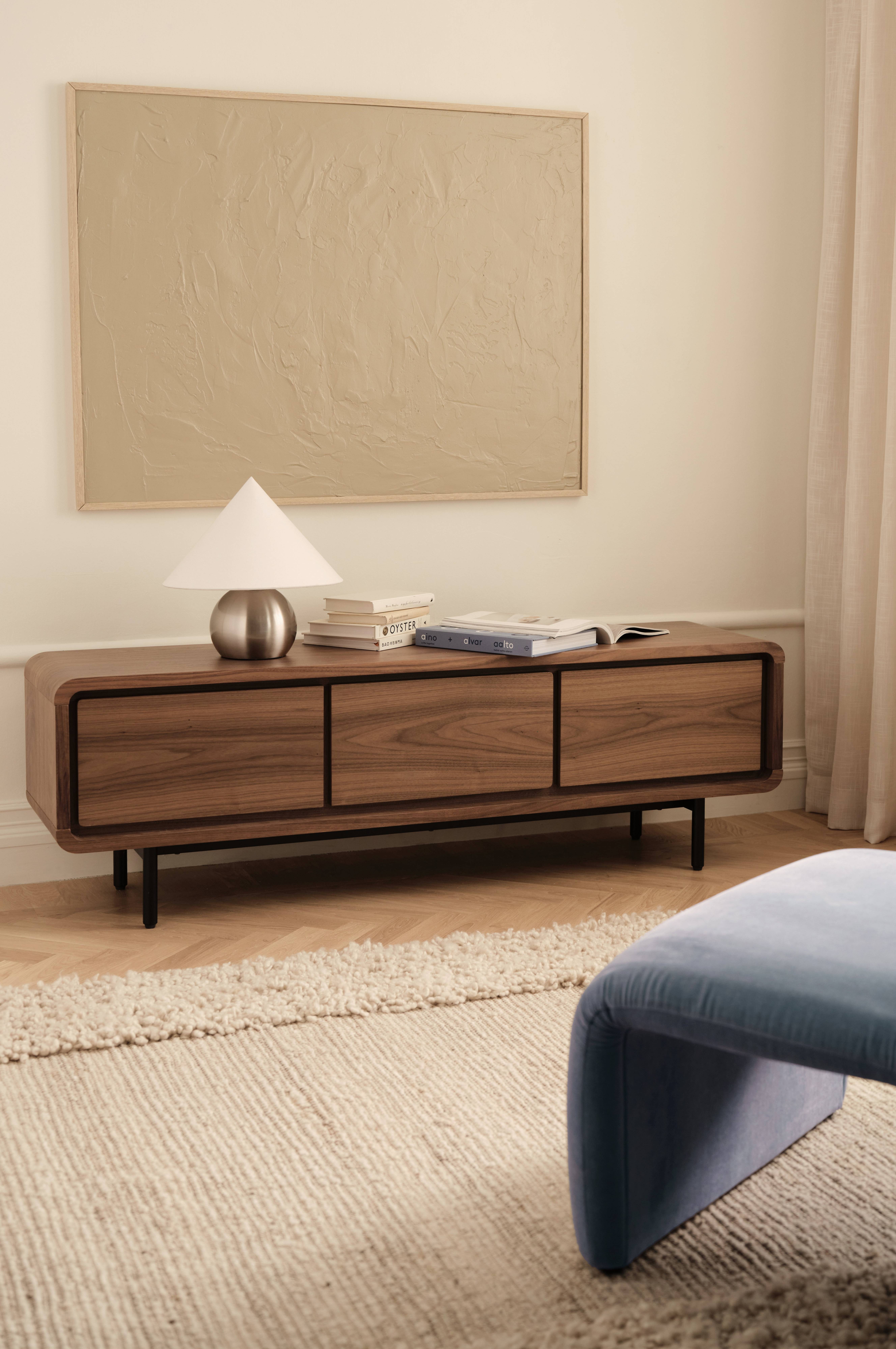 • Tv-bord i Valnøddefinér MDF• Ben i pulverlakeret metal• Tre hylder med døre, der kan åbnes udad• Mål på indvendig hylde: Højde 27 cm, dybde 16,5 cm• Fri højde under møbler: 16,5 cm
