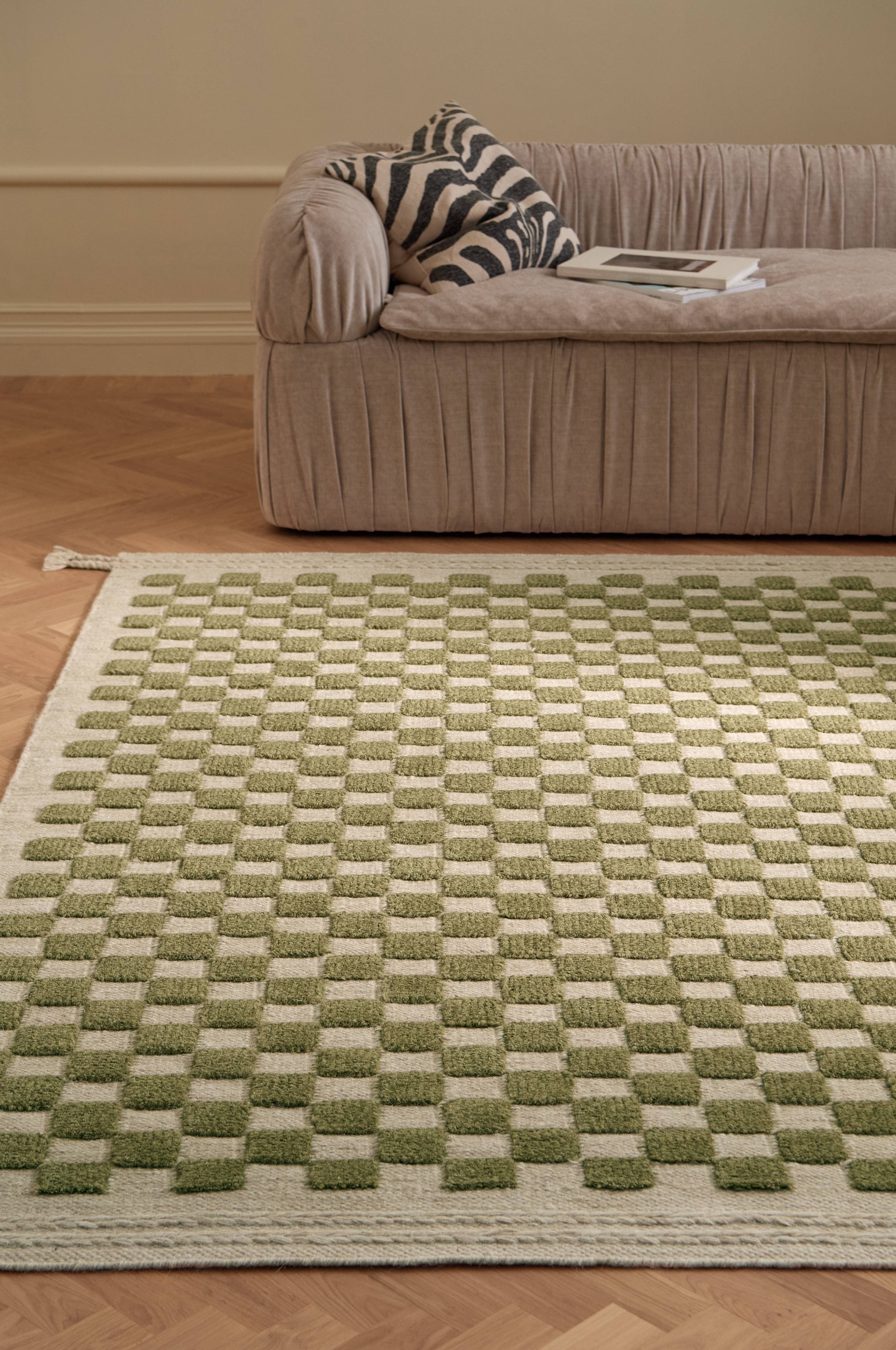 • Håndvævet uldgulvtæppe • Kvadrater med anderledes niveauer • Flettede kanter med kvaster på afslutningerne • Indien har en lang historie med håndvævede, smukke tæpper. Vores uldtæpper er vævede af dygtige indiske tæppemagere med en lang tradition for væveteknik og håndværk. • For øget sikkerhed og komfort kan du bruge en skridsikker måtte, der holder tæppet på plads. Vi har skridsikre måtter i flere størrelser. • Vaskeanvisning: Støvsugning og pletfjerning
