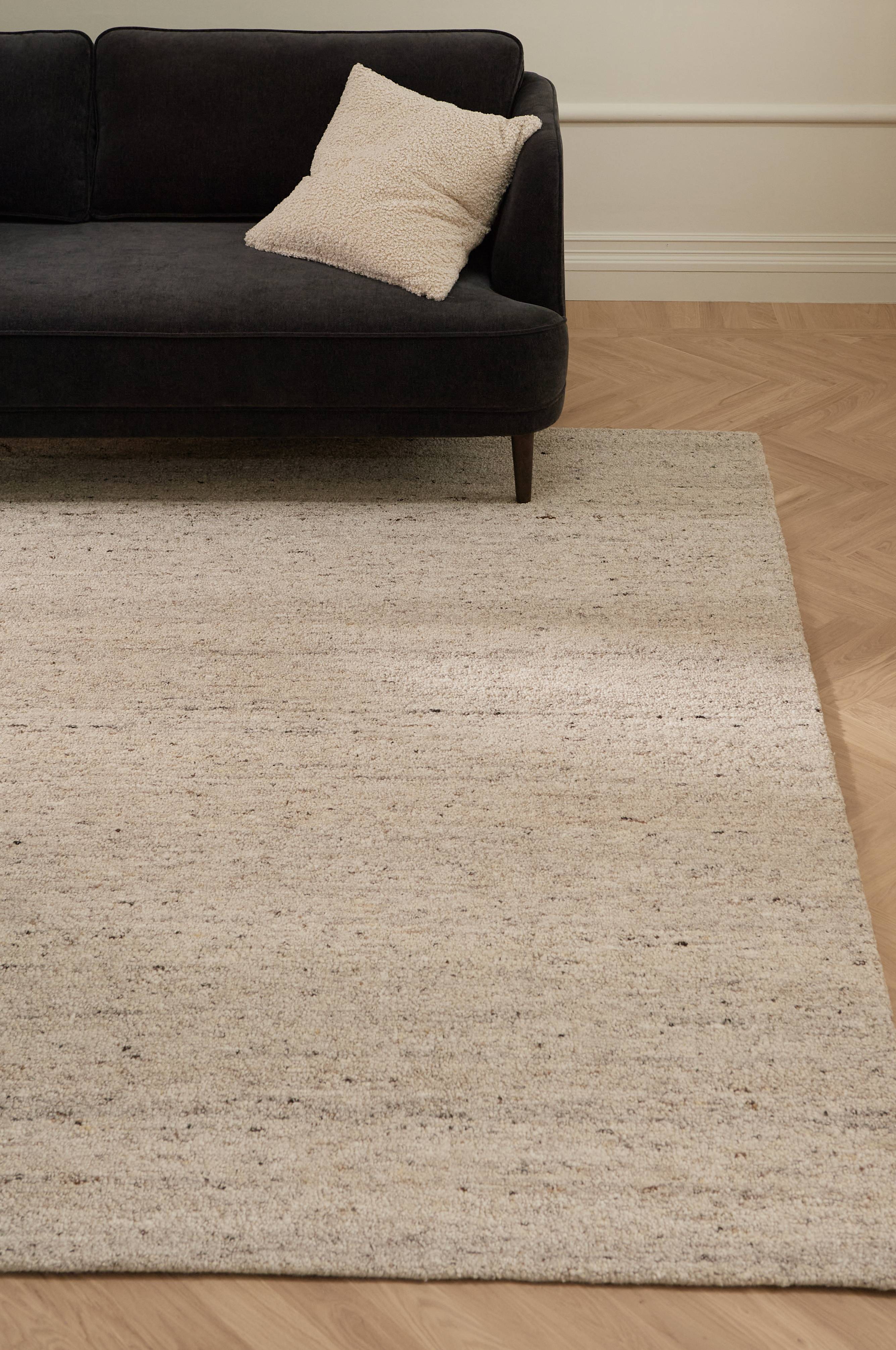 • Håndtuftet uldgulvtæppe i bouclé-look med irregulær struktur • Tæppet har en bomuldsblandet bagside (underside), som gør det fast til gulvet og let at støvsuge. • Plejevejledning: Støvsug regelmæssigt med et mundstykke uden børste. Uldtæpper er naturligt smudsafvisende takket være uldens fedtstoffer. Snavs lægger sig på overfladen og vil blive støvsuget op eller blæst væk. Mindre pletter kan vaskes med en fugtig klud med lunkent vand. Indsend til professionel rengøring.