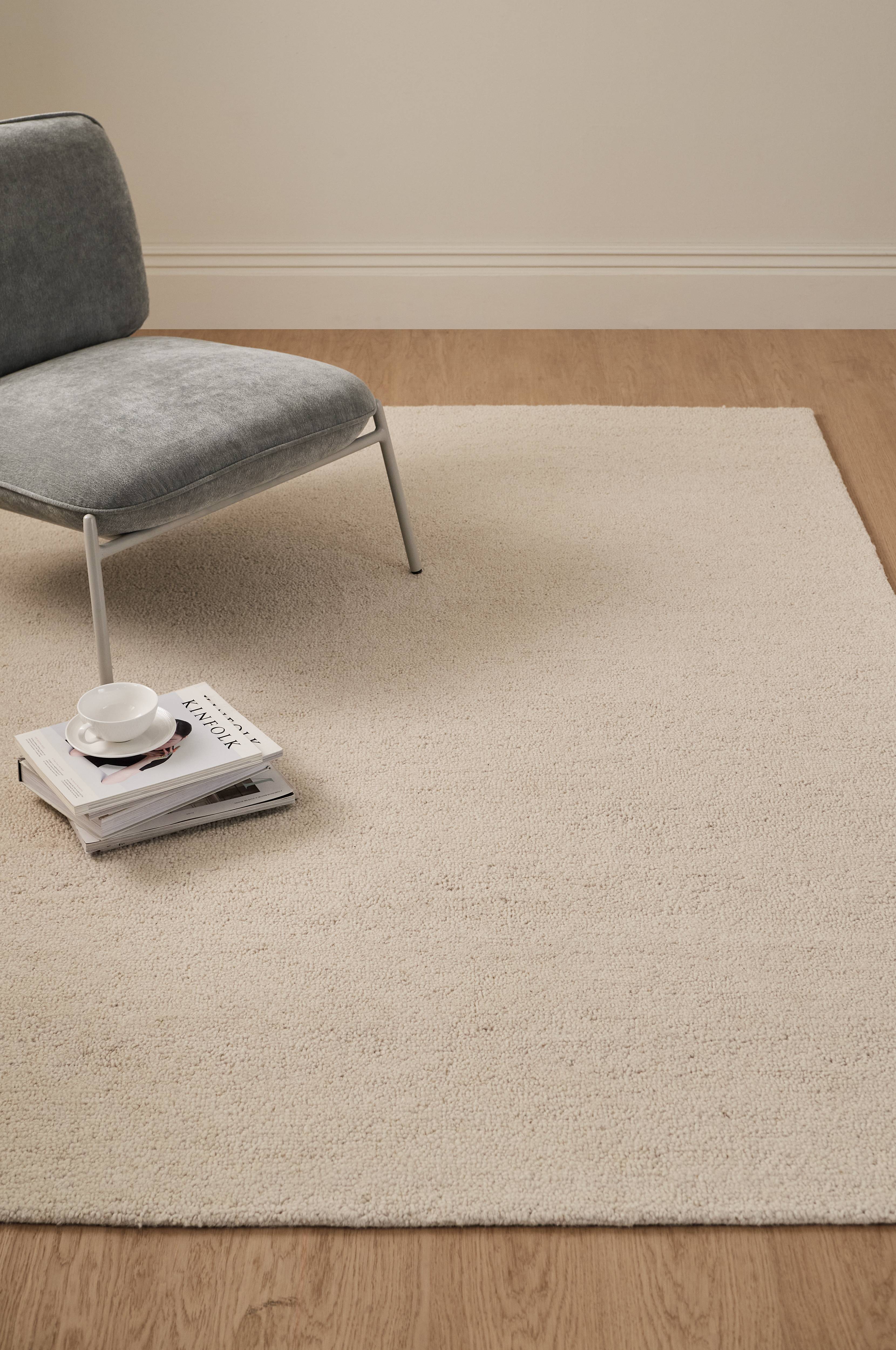• Håndtuftet uldgulvtæppe i bouclé-look med irregulær struktur • Tæppet har en bomuldsblandet bagside (underside), som gør det fast til gulvet og let at støvsuge. • Plejevejledning: Støvsug regelmæssigt med et mundstykke uden børste. Uldtæpper er naturligt smudsafvisende takket være uldens fedtstoffer. Snavs lægger sig på overfladen og vil blive støvsuget op eller blæst væk. Mindre pletter kan vaskes med en fugtig klud med lunkent vand. Indsend til professionel rengøring.