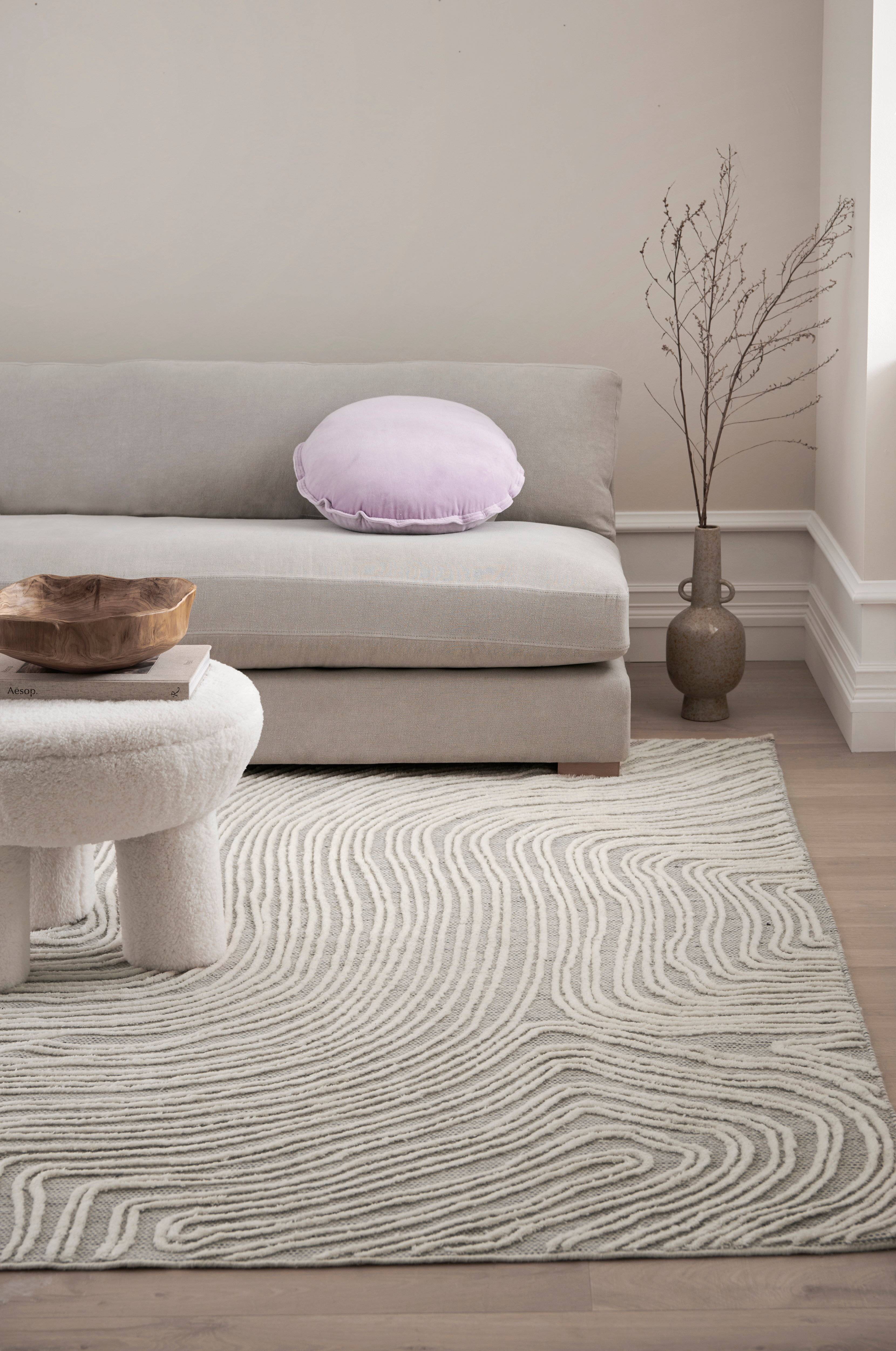 Håndvævet uldtæppe med et tuftet, økologisk mønster.