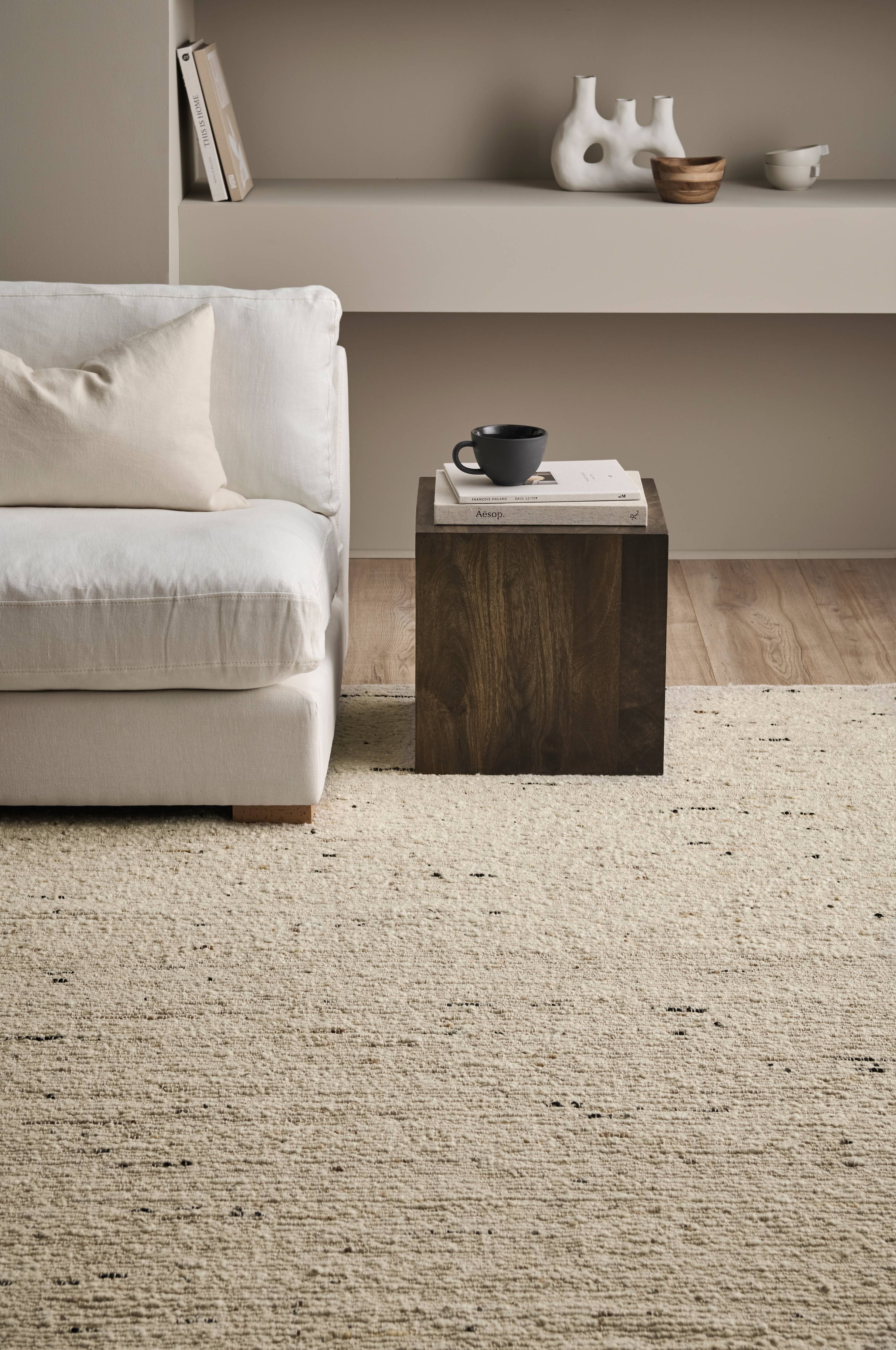 Vævet uldtæppe med mønster i forskellige tykkelser og varierede, uregelmæssige strukturer.