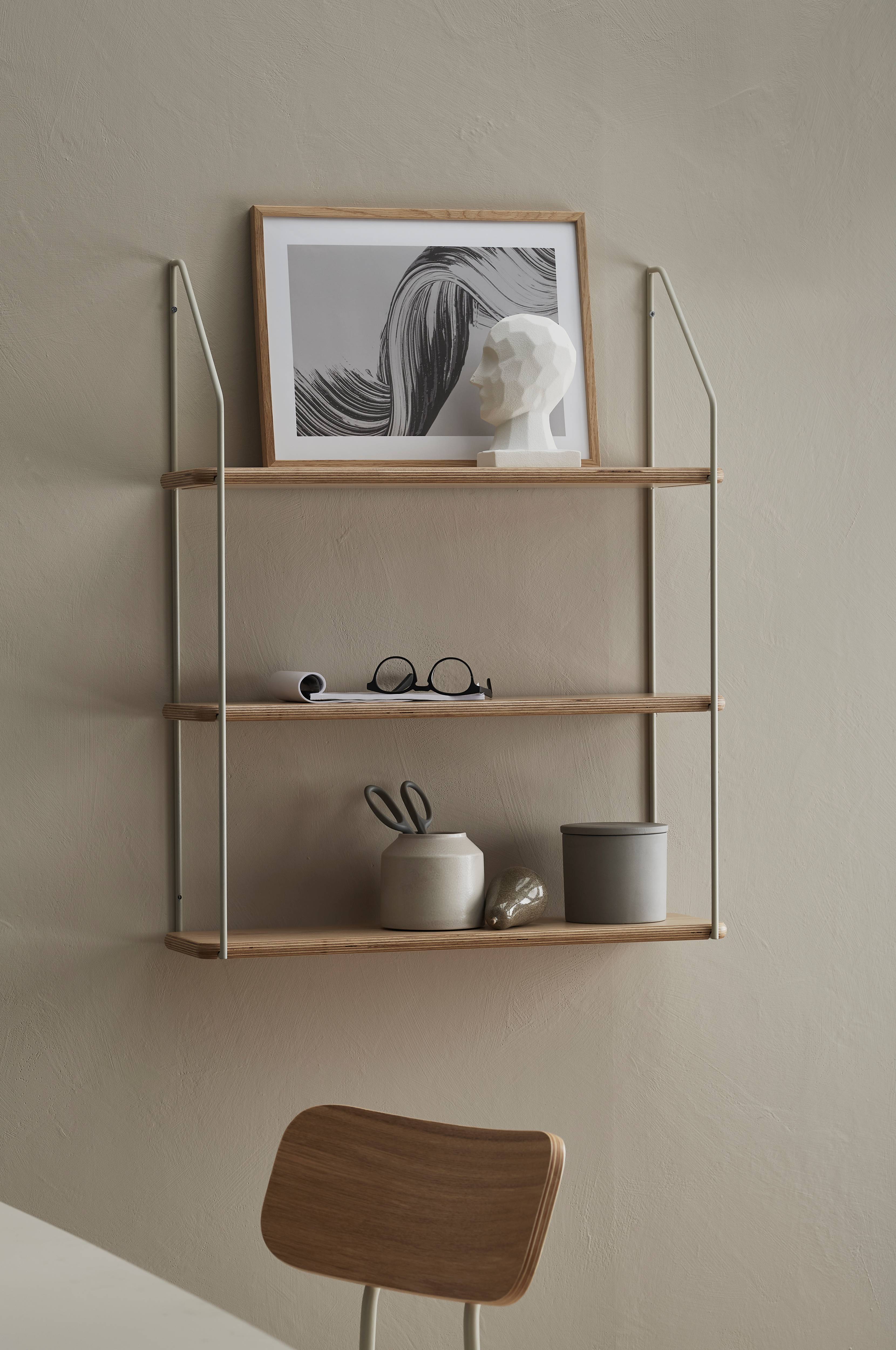 Hylde i plywood af høj kvalitet med askfinér og pulverlakeret metal. Højde 81 cm, bredde 21 cm, længde 65 cm. Lettere montering.