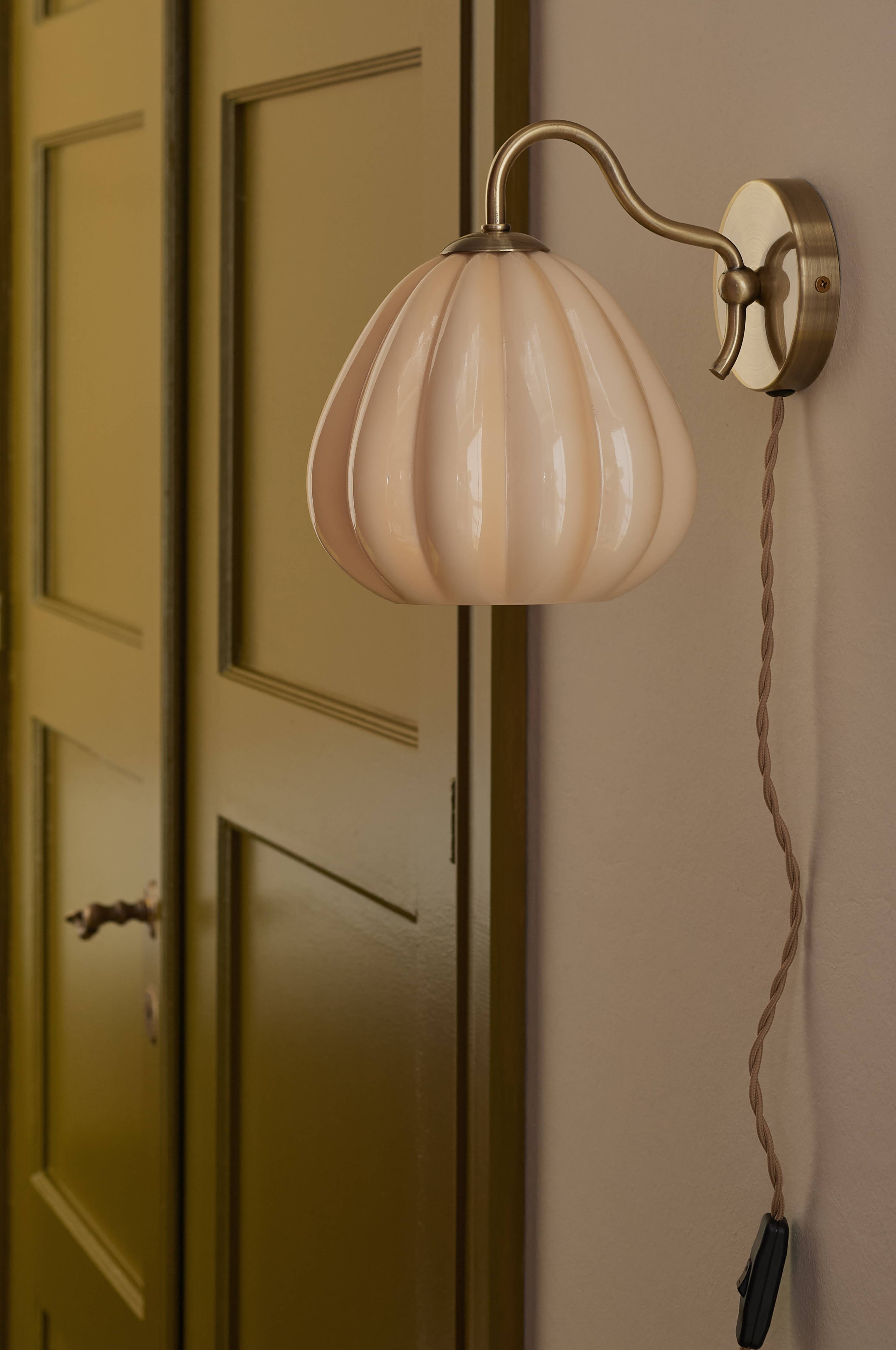 • Væglampe i metal med Antik messing-finish• Skærm i farvet glas• Tvistet Tekstilsnor med kontakt• Pære medfølger ikke