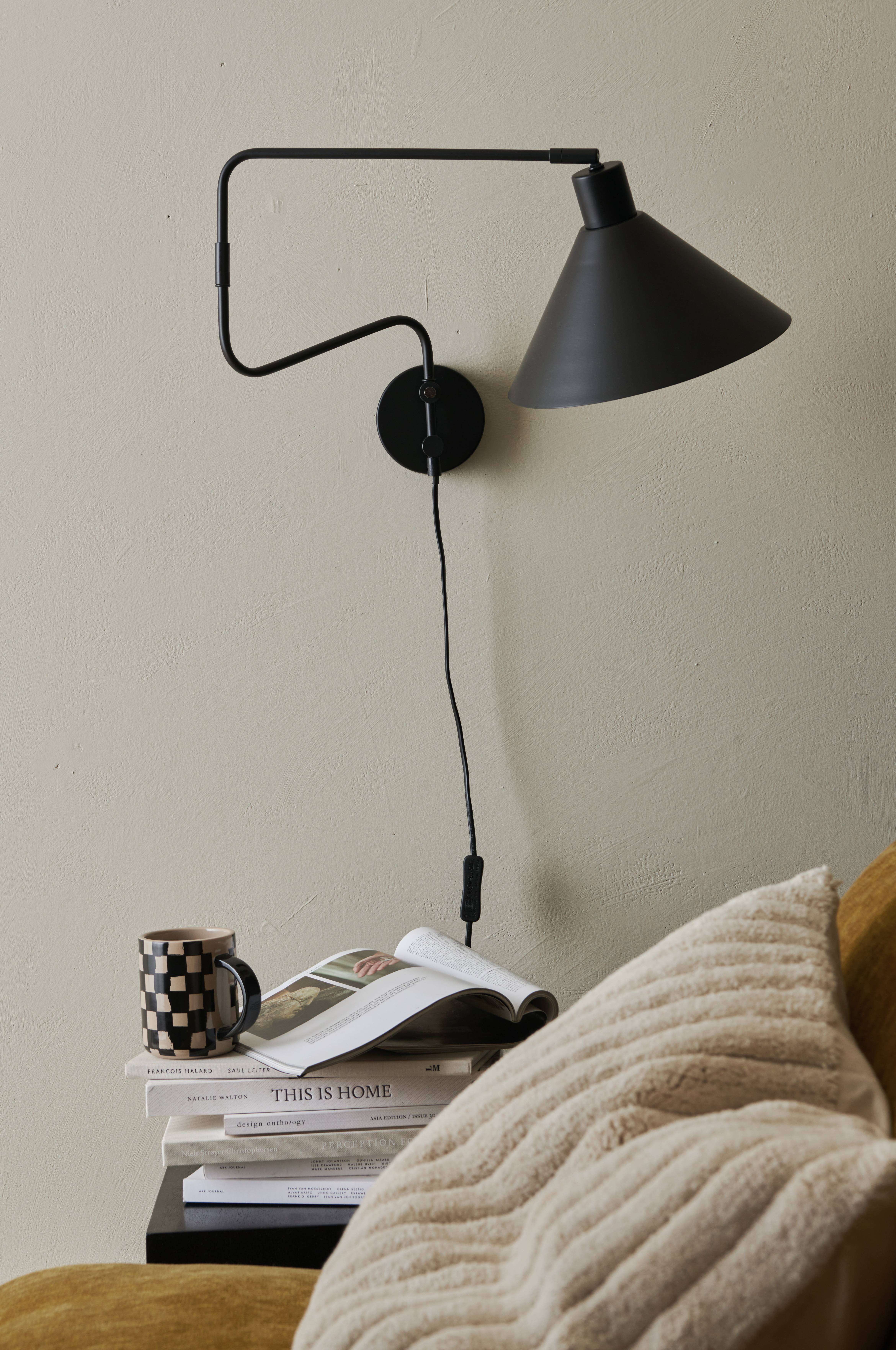 Væglampe i metal med en drejelig arm, som går ud fra væggen, og skærm, der kan justeres i højden og til siden.