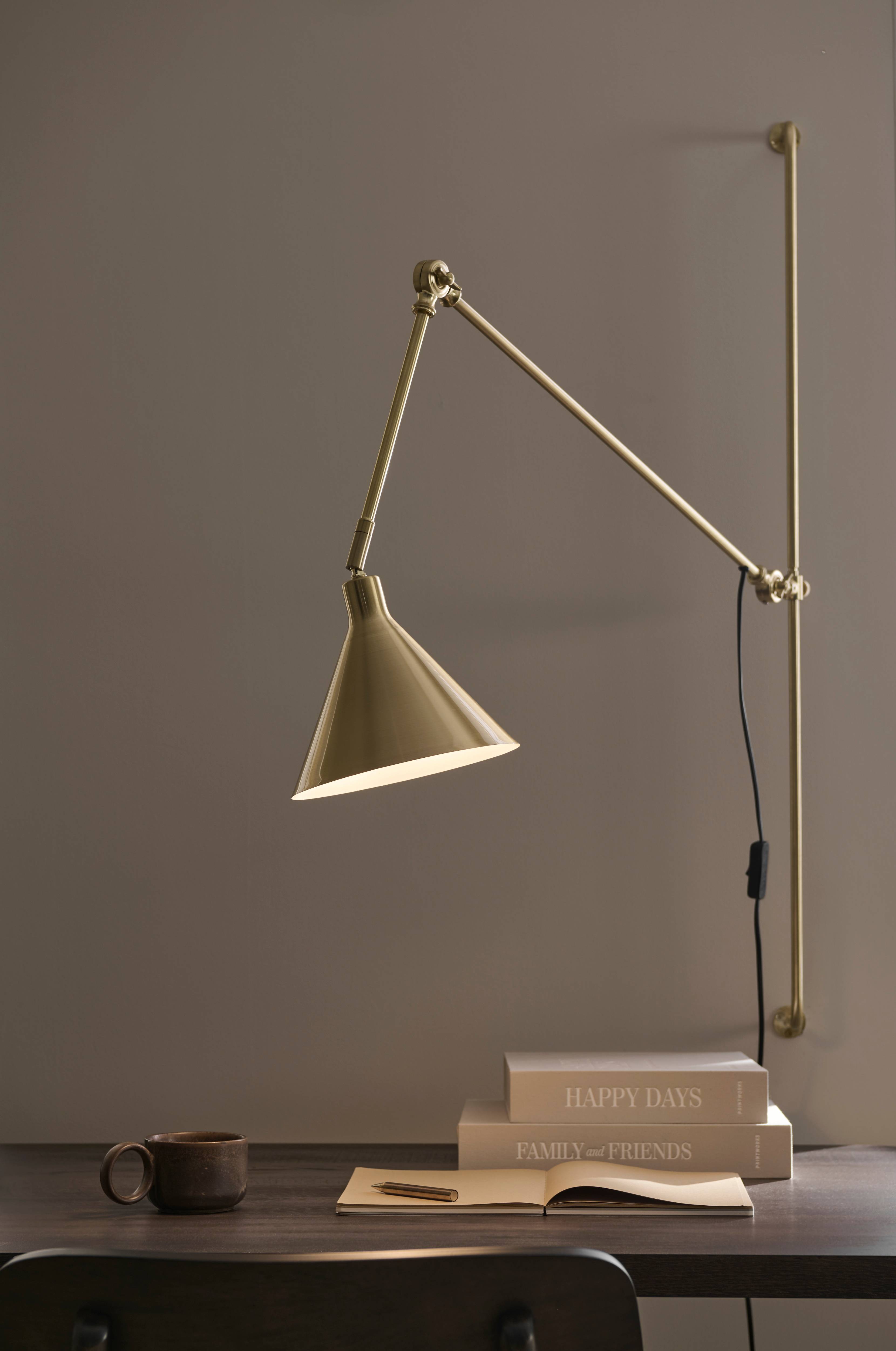 Væglampe i pulverlakeret metal, monteret på et vægbeslag med højden 100 cm. Den lange arm, som holder lampeskærmen, kan justeres opad og nedad. På den lange arm sidder en lille, justerbar arm som holder lampeskærmen. Skærmen har hvid inderside og er justerbar i højden og til siden. Hele lampen kan justeres på vægbeslaget i højden og til siden. Længde på armene er hhv. 60 og 20 cm. Mål på skærm: højde 17 cm, Ø 20 cm. Maks. totallængde fra væg 118 cm. Plastledning med afbryder, ledningslængde 2 m. Stor sokkel E27. Maks. 25 W. Pære medfølger ikke.