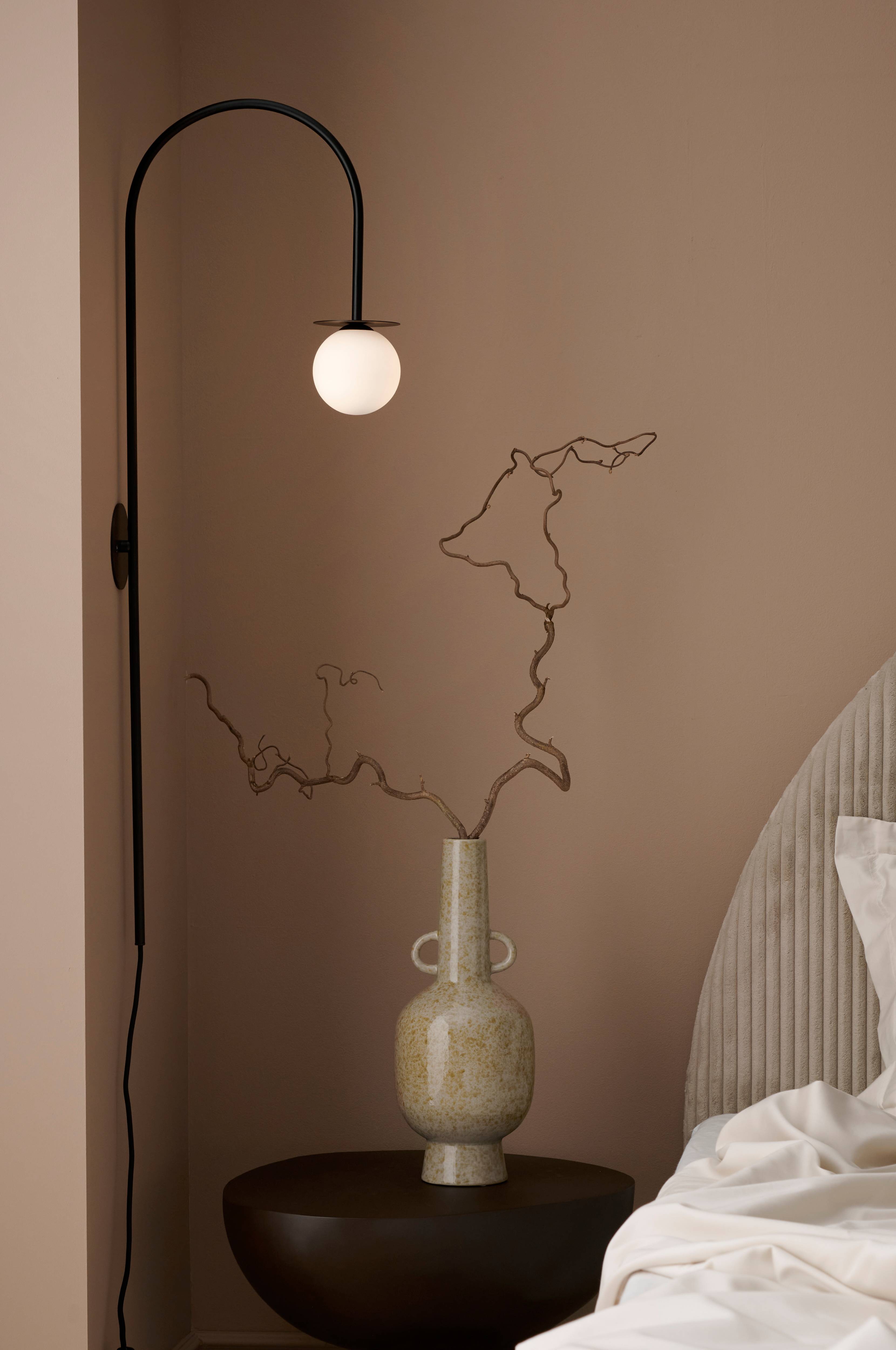 Væglampe i metal med kuppel i opalhvidt glas. Kuplen fastgøres og løsnes med skruefunktion. Vægpladens diameter er 10 cm, glaskuplens diameter er 9 cm. Stofledning med afbryder og stik. Pære medfølger ikke.