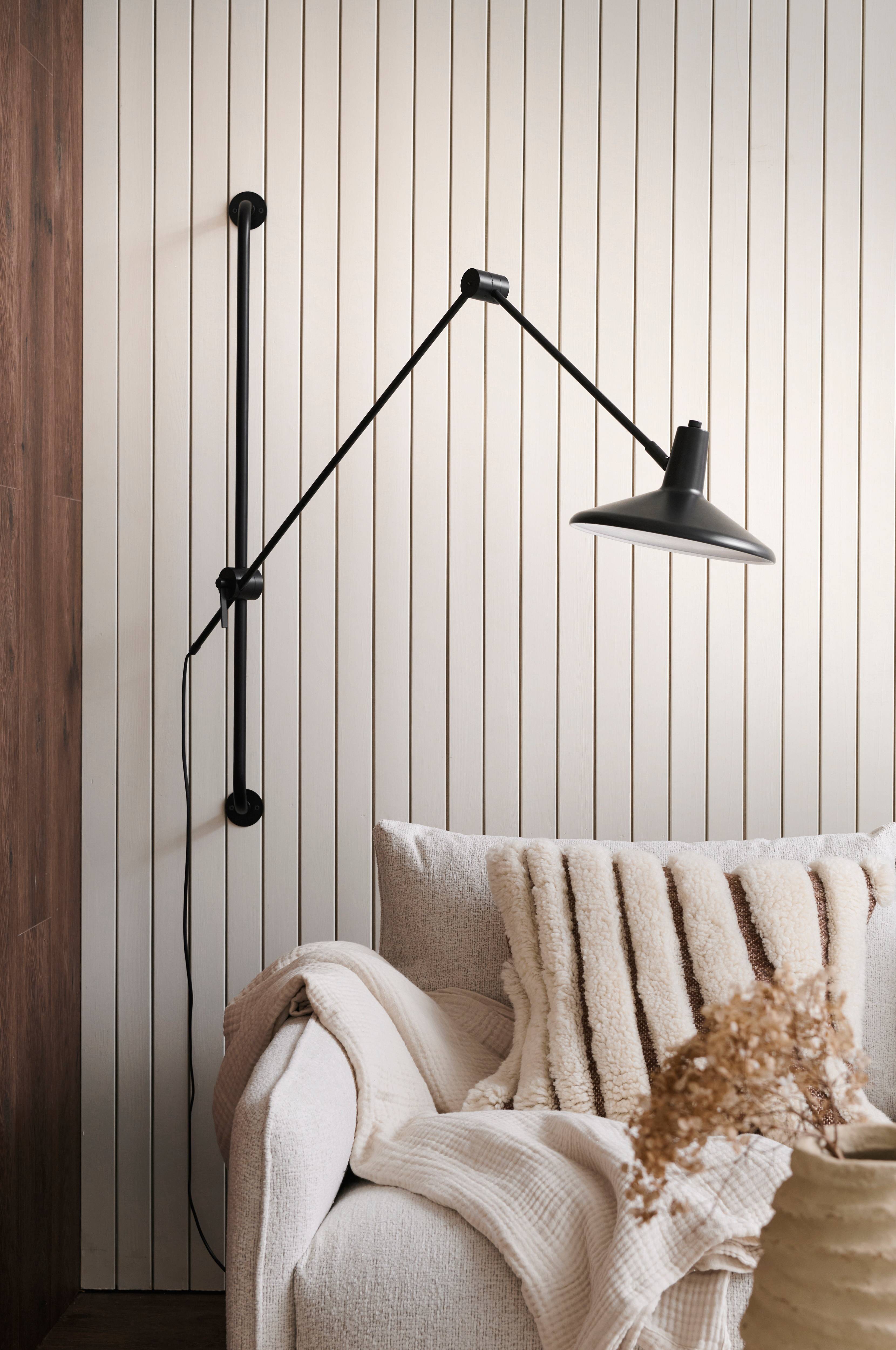 Væglampe i sort mat metal, monteret på et vægbeslag med højden 100 cm. Den lange arm, som holder lampeskærmen, kan justeres opad og nedad. På den lange arm sidder en lille, justerbar arm som holder lampeskærmen. Skærmen har hvid inderside og er justerbar i højden og til siden. Hele lampen kan justeres på vægbeslaget i højden og til siden. Længde på armene er hhv. 81 og 44 cm. Mål på skærm: højde 13 cm, Ø 24,5 cm. Maks. totallængde fra væg 118 cm. Plastledning med strømafbryder. Pære medfølger ikke.