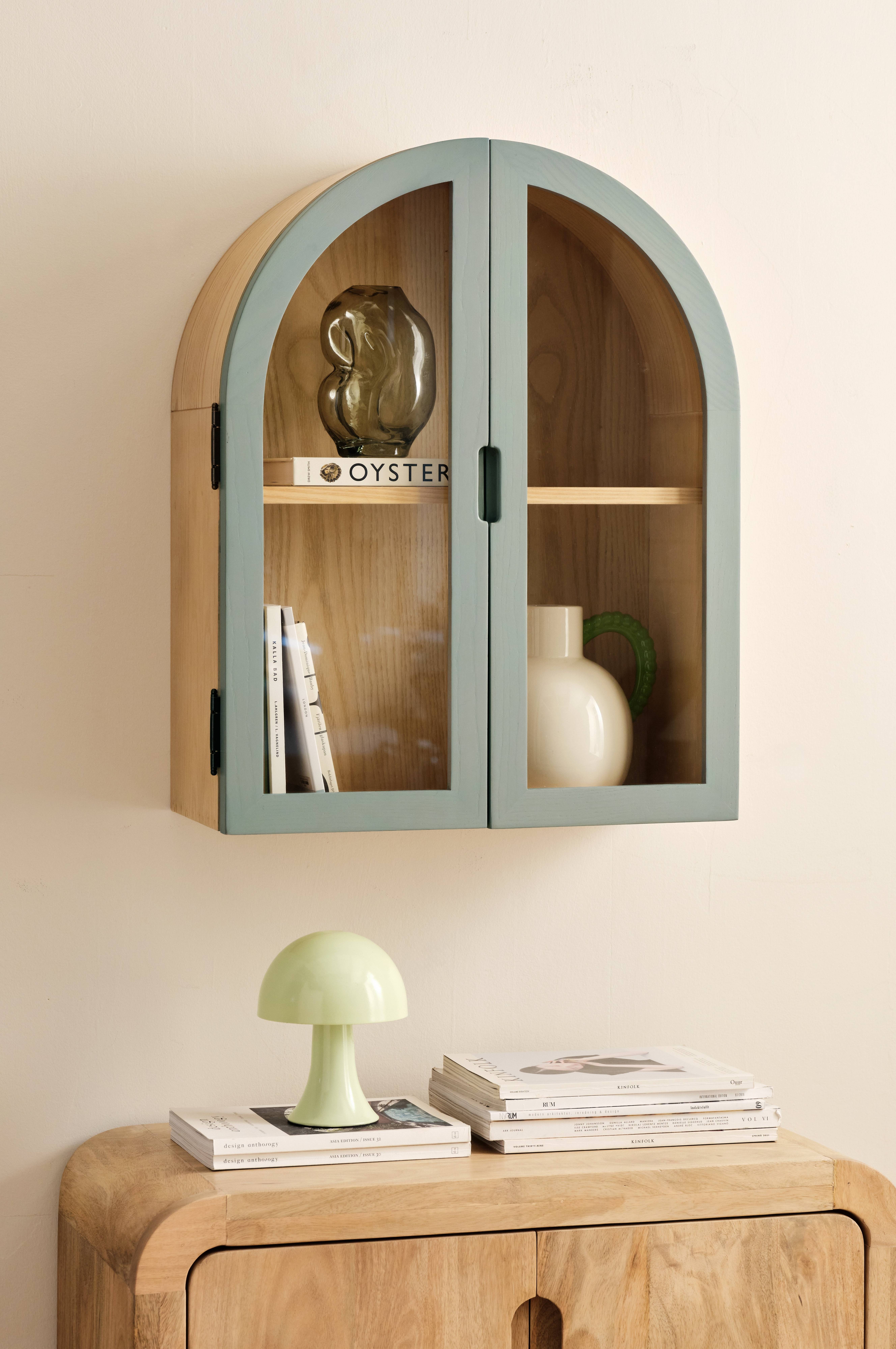 • Skabe til vægophængning • Design i fineret ask krydsfiner og massiv ask • To døre i massiv ask med hærdet glas • Magnetisk lukning • En fast hylde • Afstand mellem hylder: 30/33 cm
