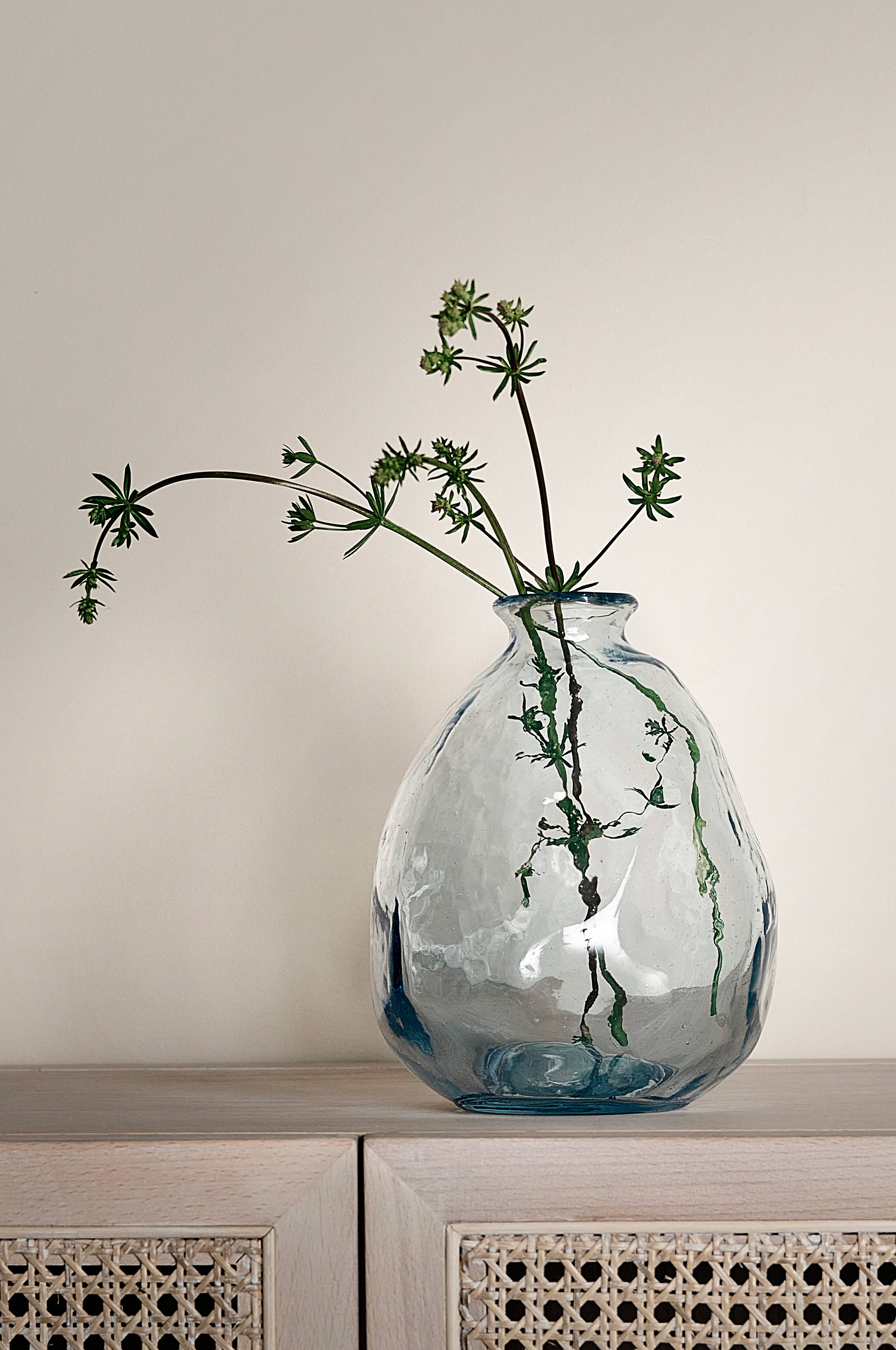 Vase af glas med uregelmæssig, bulet form. Diameter det største sted ca. 16 cm, indvendig diameter ved åbningen 3 cm.