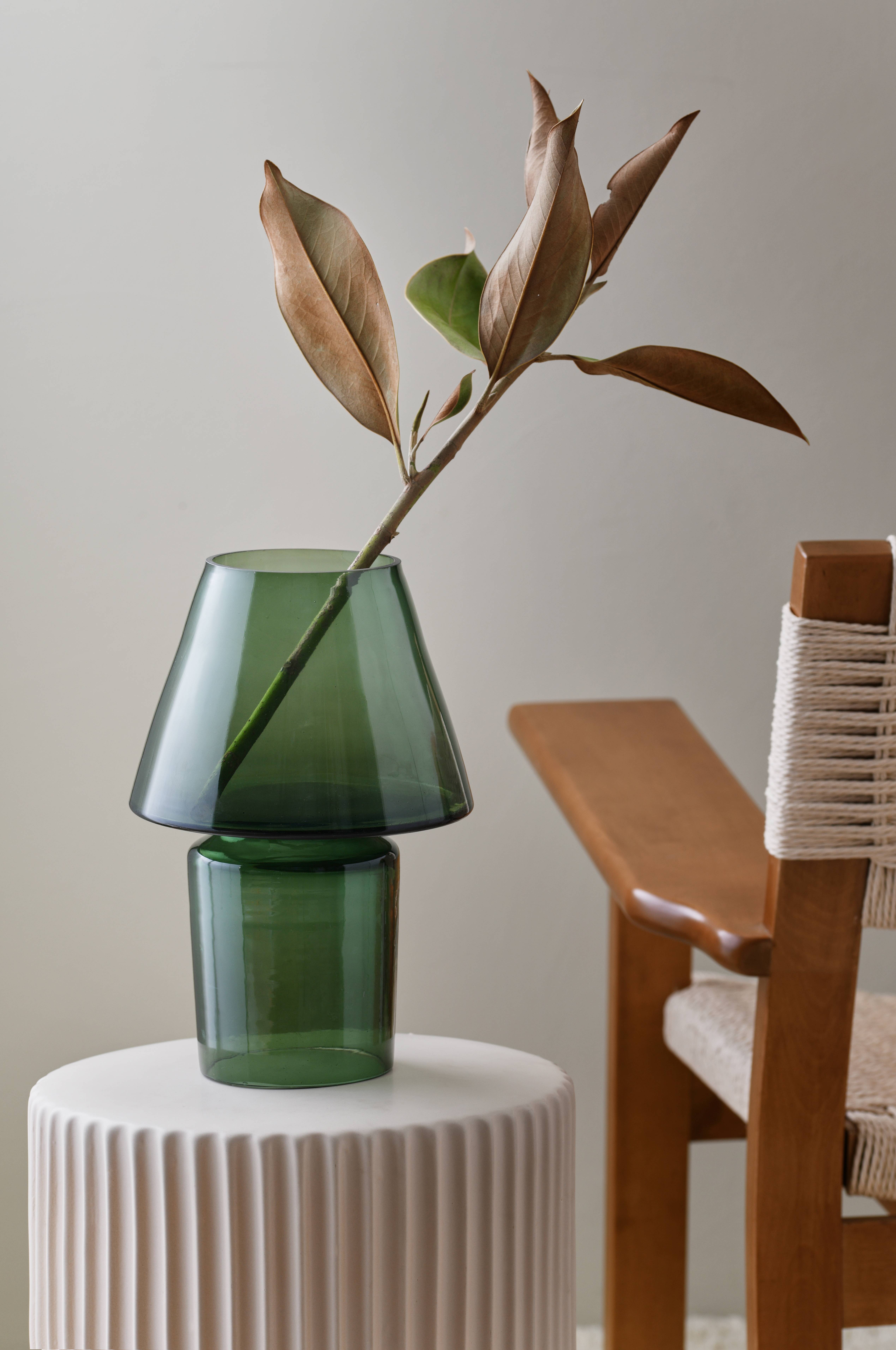 Blomstervase af glas. Højde 28 cm. Diameter det største sted 18 cm. Indvendig diameter åbningen 10 cm.