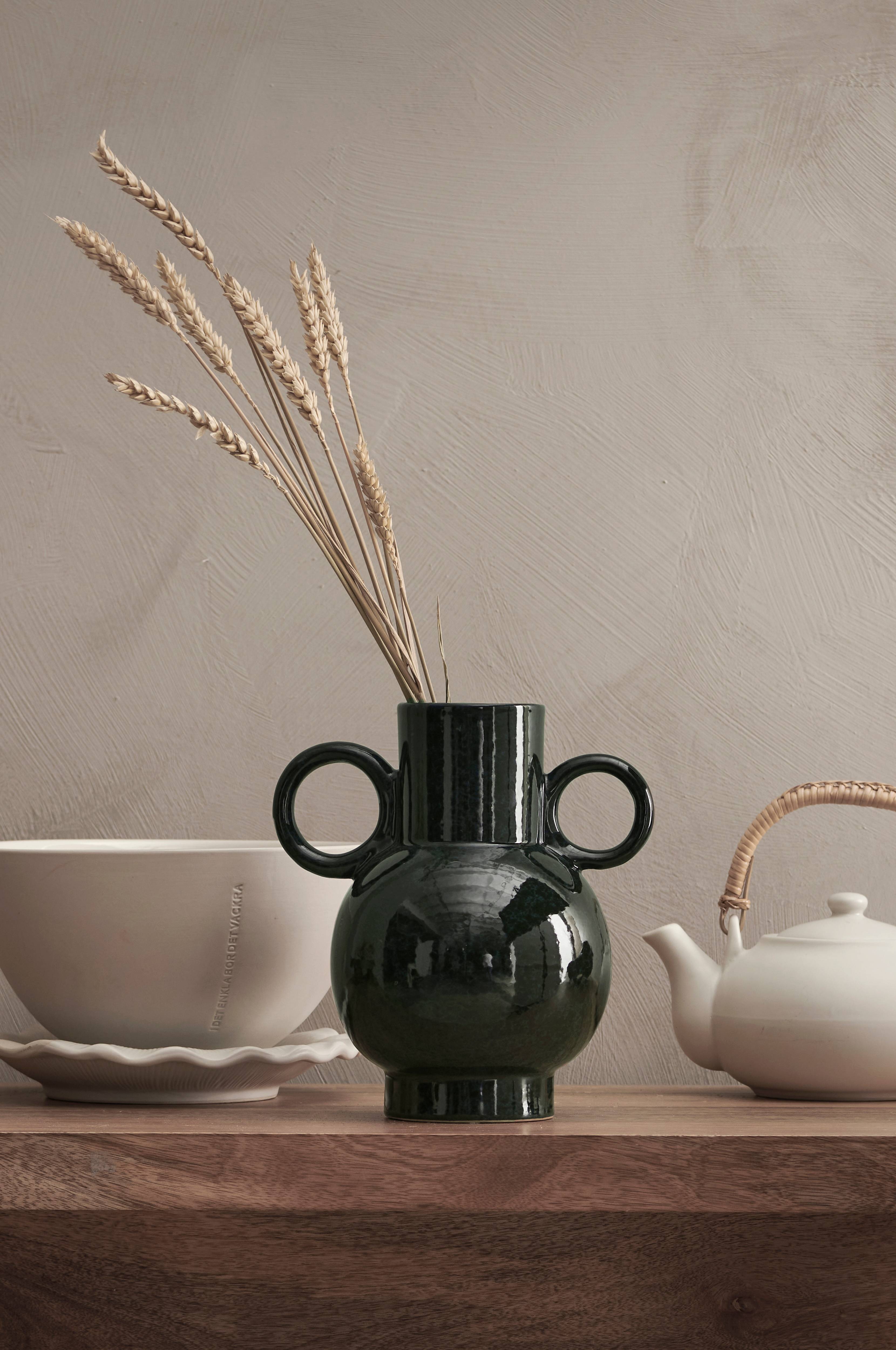 Vase/kande af glaseret stentøj med hank. Højde ca. 21 cm. Diameter foroven 7,5 cm (indvendigt mål 6,5 cm). Bredde hvor den er stärst inklusive hank, ca. 20 cm. Rengøres i hånden.