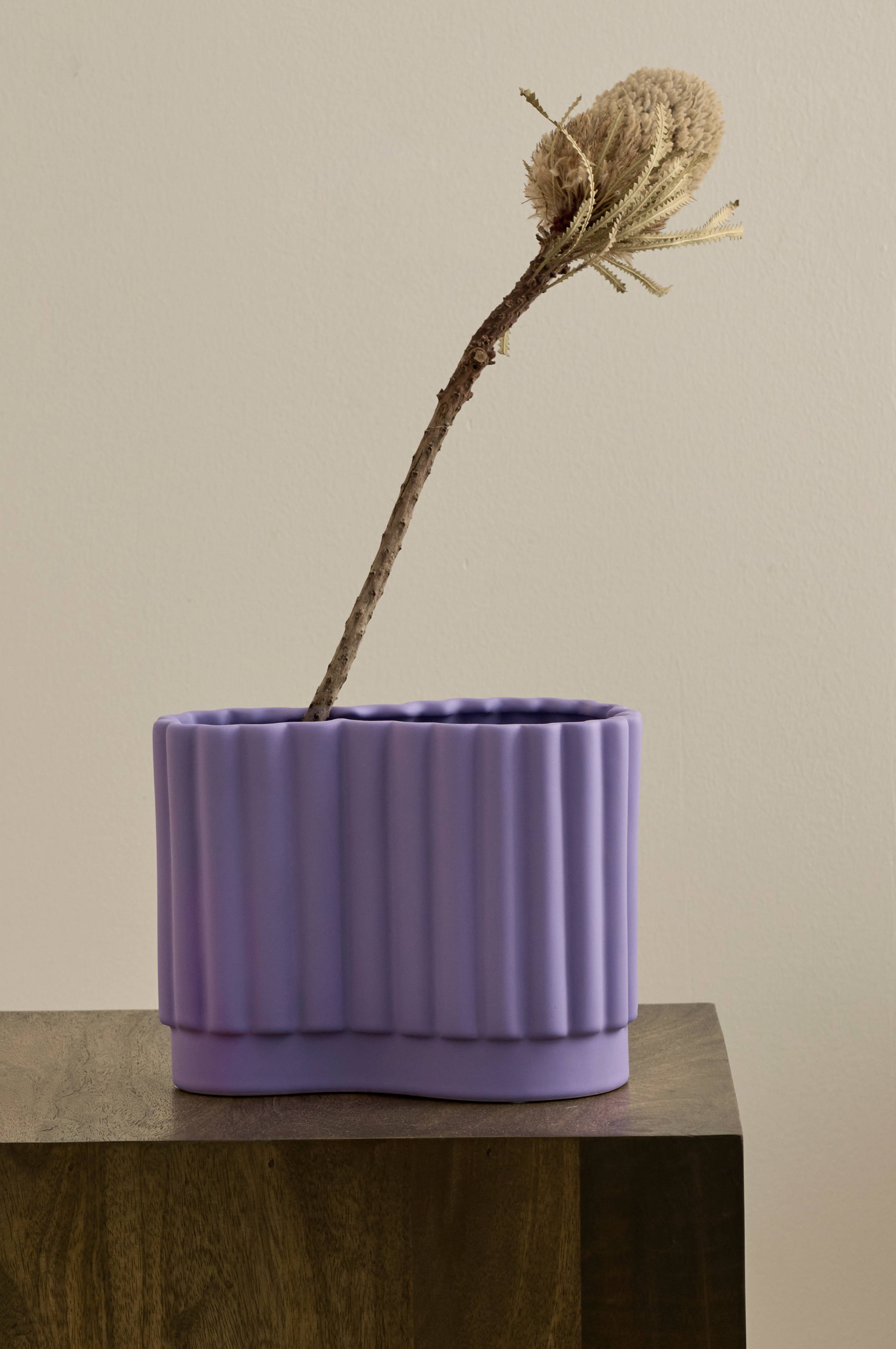 Dekorativ krukke eller vase af stentøj i asymmetrisk form med ribstruktur. Vandtæt.