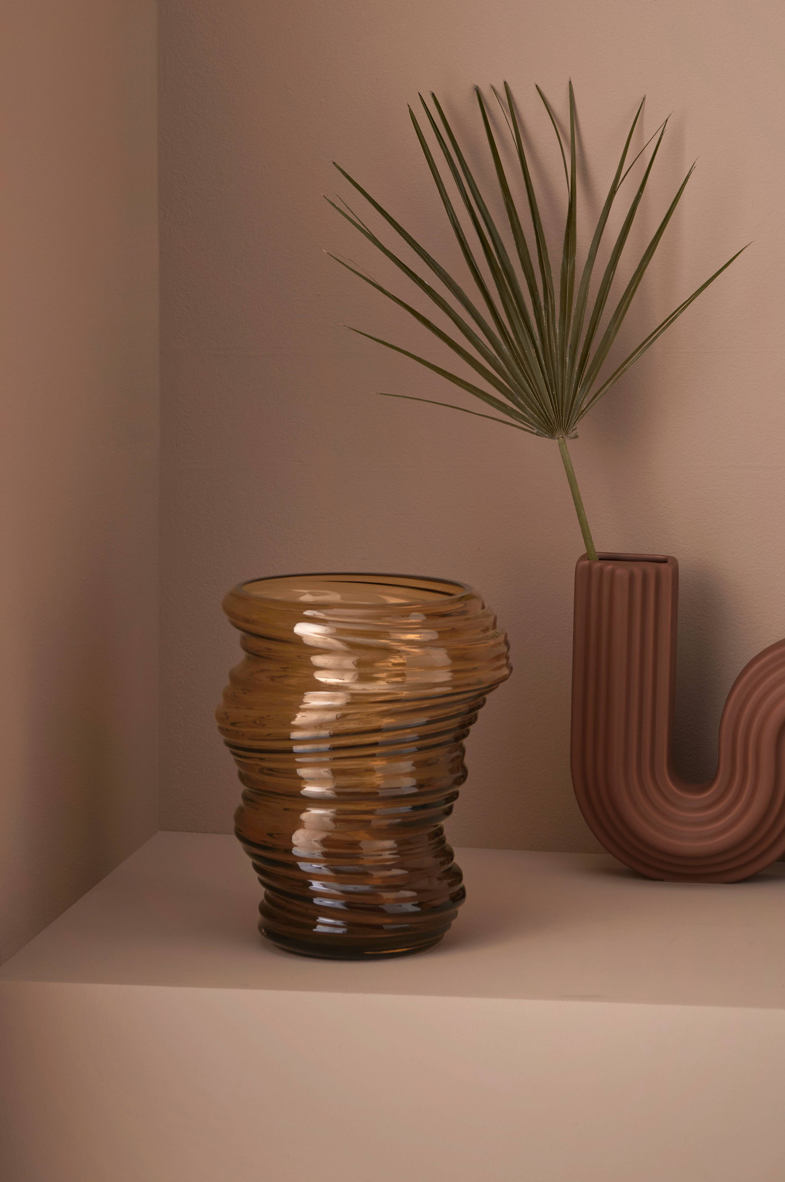 Vase/lanterne af glas med bløde organiske former. Diameter forneden ca. 12,5 cm, diameter foroven ca. 19 cm. Rengøres i hånden.