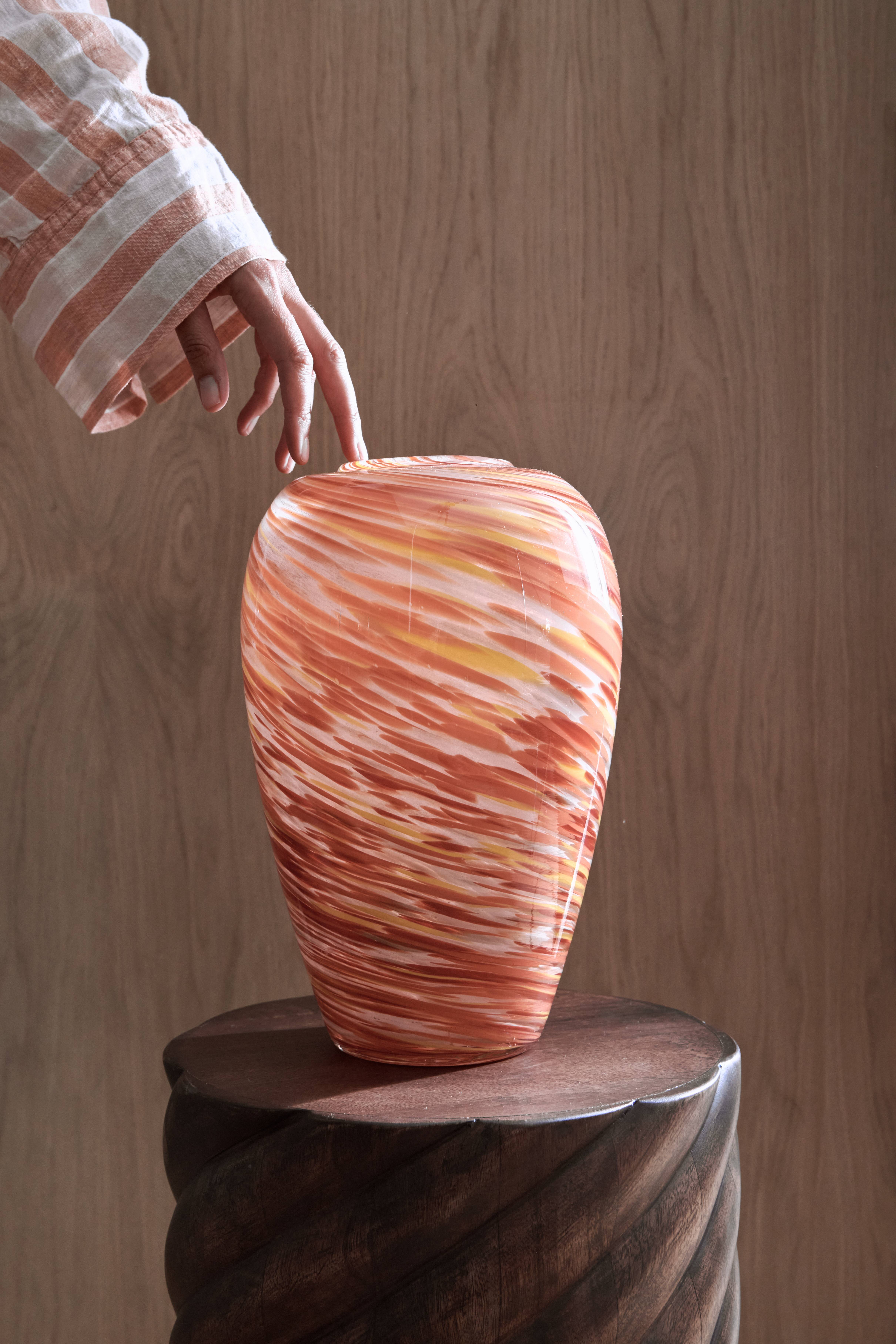 Dekorativ vase af glas. Største diameter ca. 19 cm. Indvendig diameter åbningen 7,5 cm.
