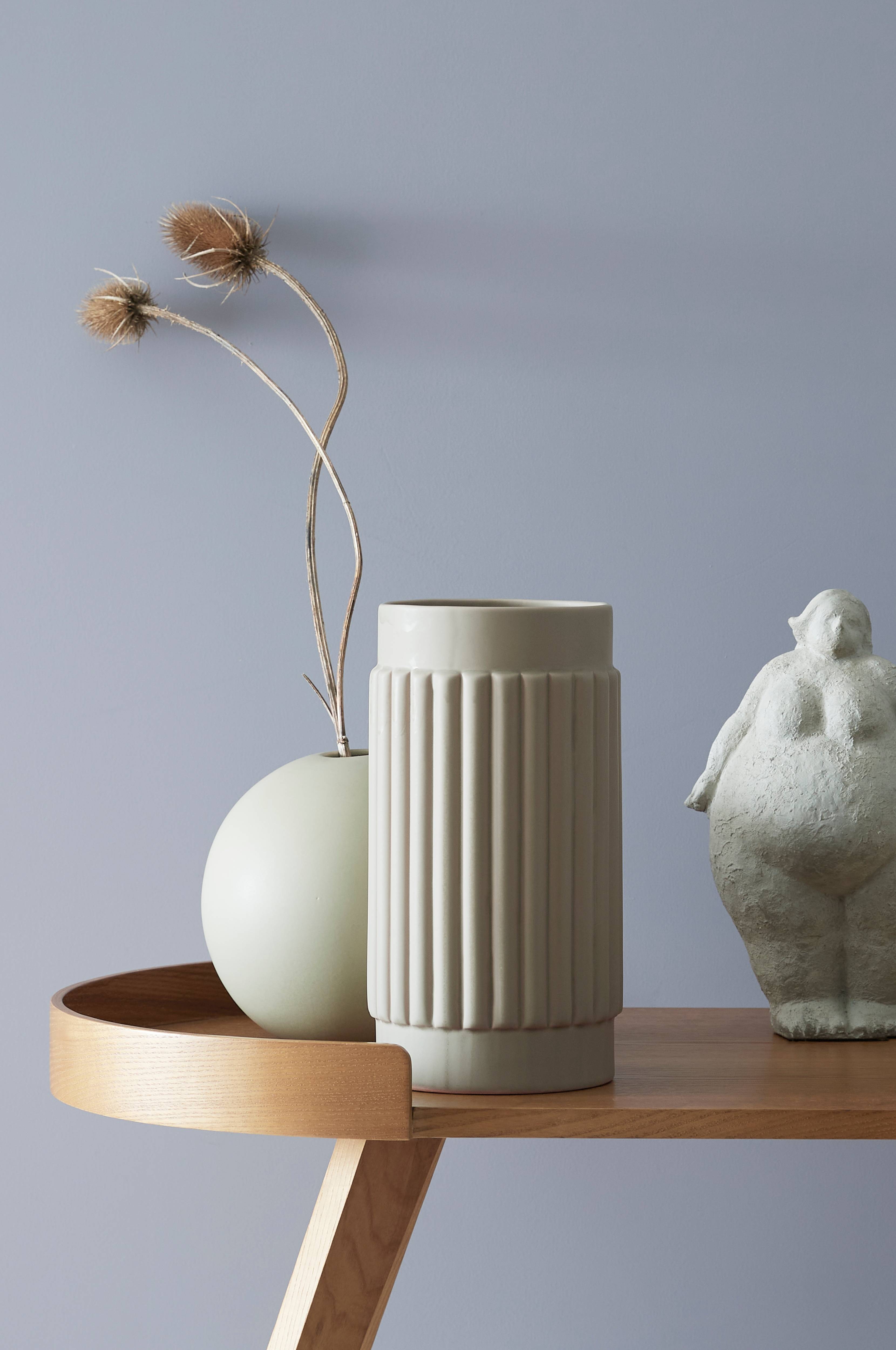 Vase i stentøj med ribbet strukturmønster. Højde 26 cm. Diameter foroven 12 cm, diameter bredeste sted 14 cm.