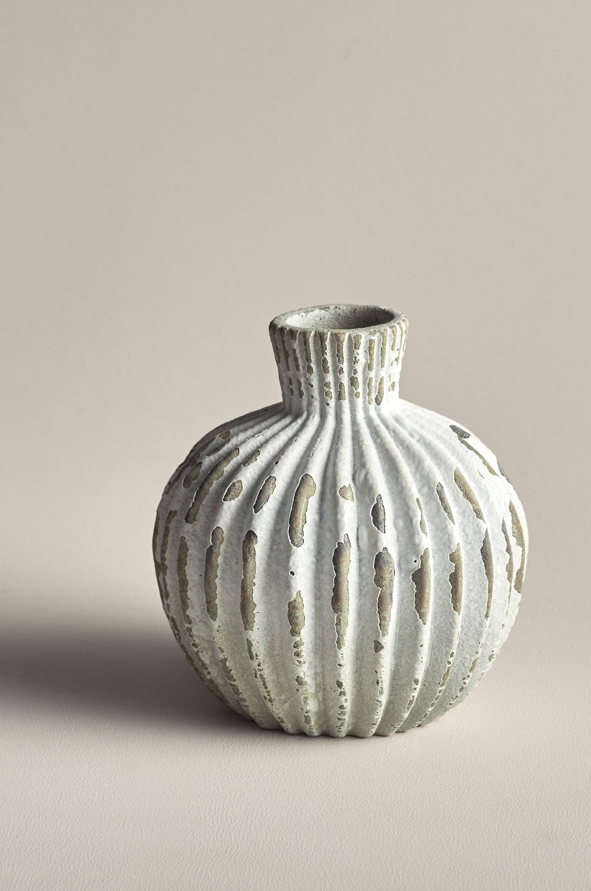 Vase i keramik med patineret finish. Største diameter 16 cm. Indvendig diameter åbningen 4,5 cm.