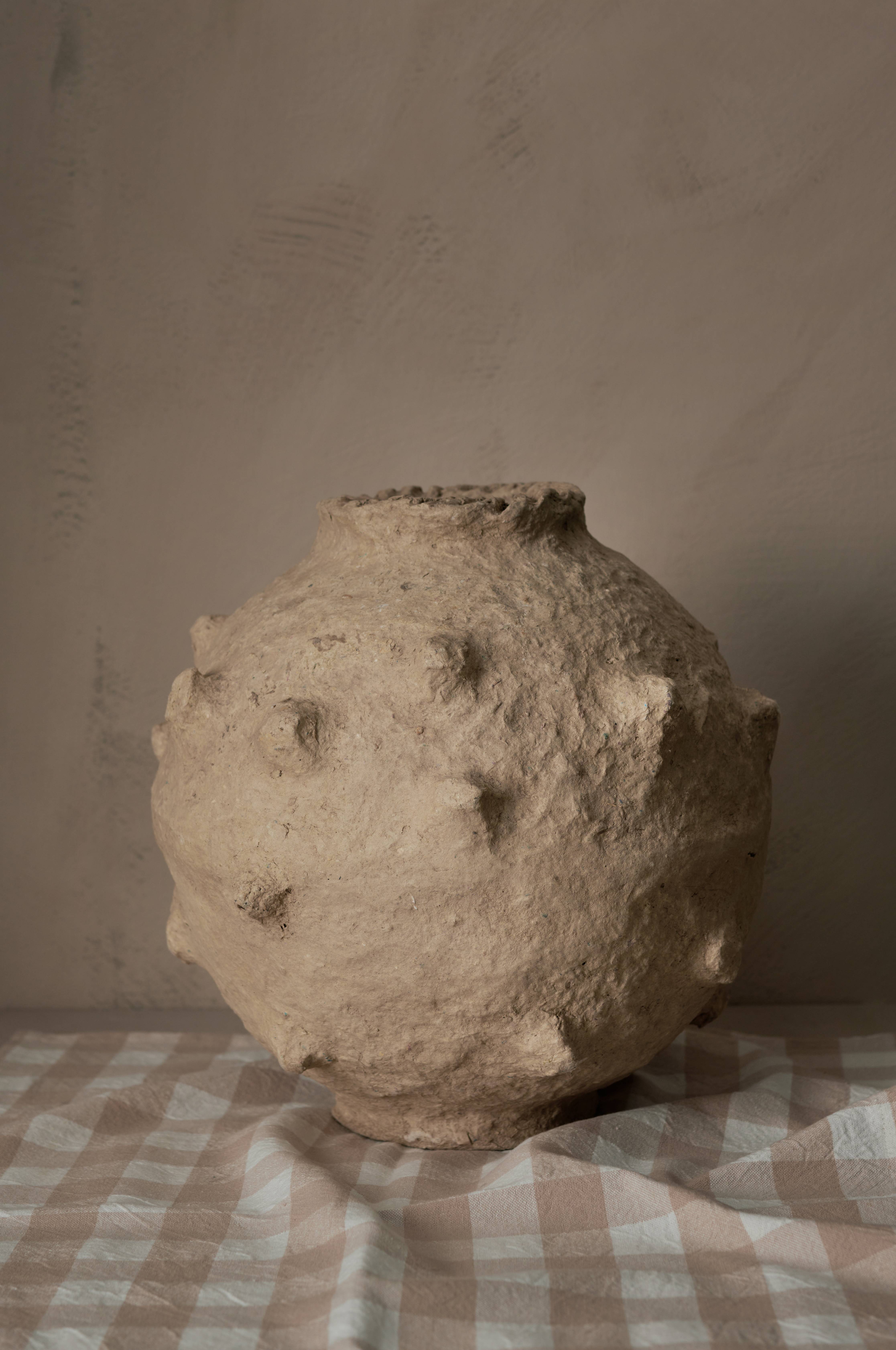 Håndlavet vase af papmaché i robust og kvalitet. Diameter det største sted ca. 30 cm, indvendig diameter ved åbningen 9 cm. Beregnet til dekoration (tåler ikke vand eller ild). Ikke til udendørs brug. Fremstillet af genindvundet papir. Da vasen er håndlavet kan der forekomme variationer i form, finish og vægt.