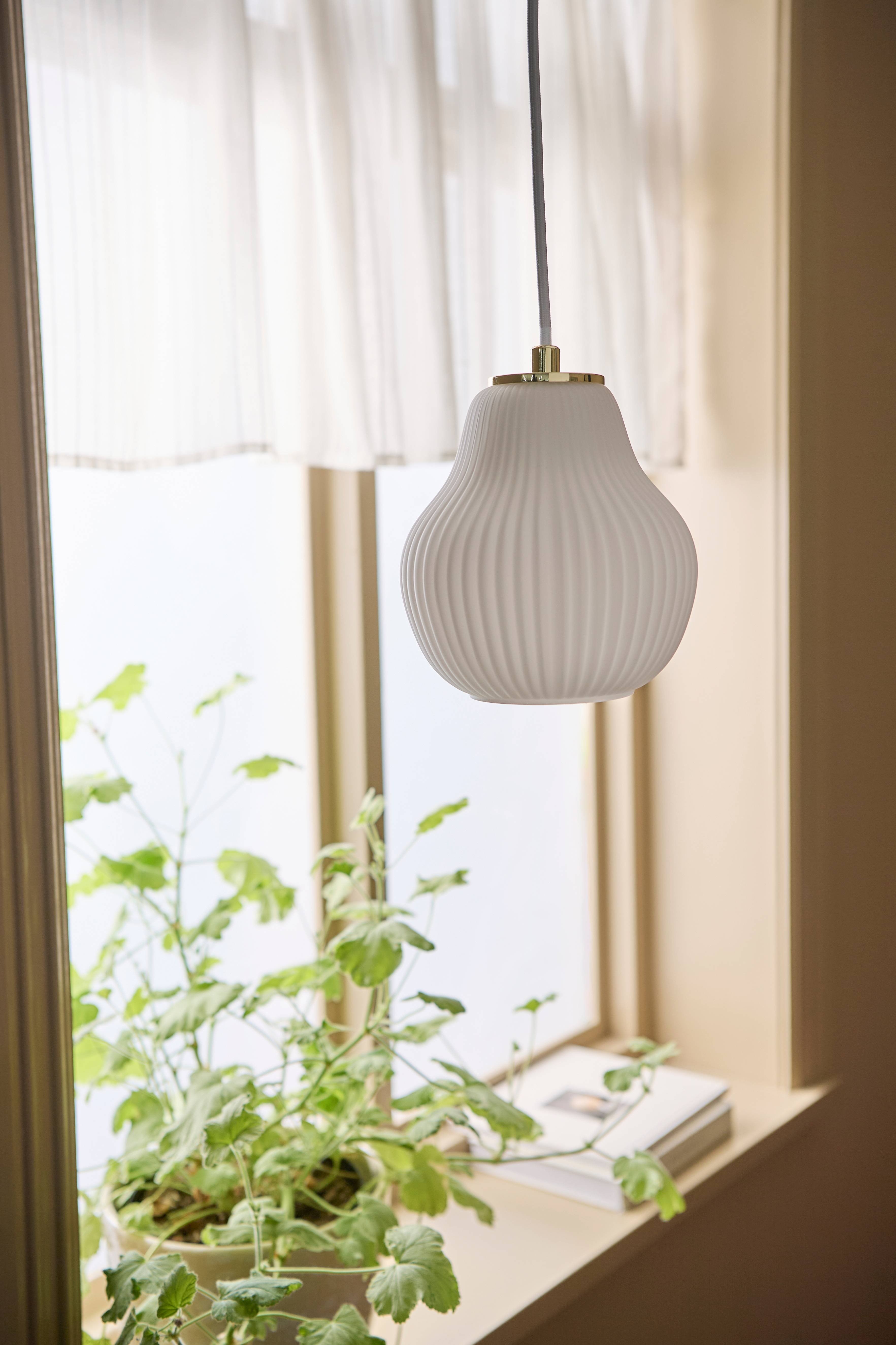 • Vindueslampe i mat, opalhvid glas med ribbet struktur• Detalje i messingfarvet metal på toppen• Tekstilsnor med kontakt• Vægstik• Pære medfølger ikke