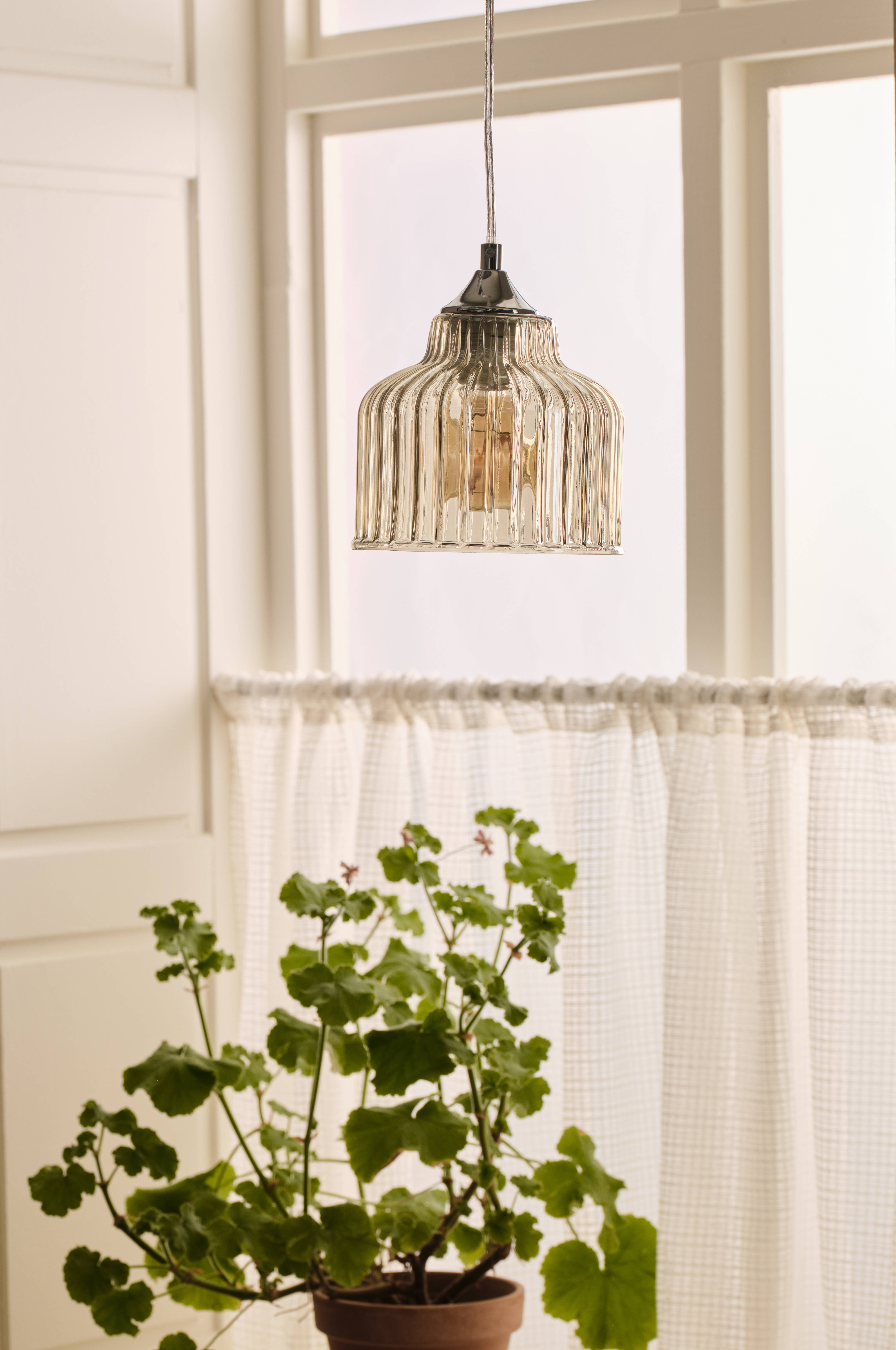 • Vindueslampe i tonet glas med ribbet struktur• Detalje i forkromet metal på toppen• Transparent plastledning med kontakt• Pære medfølger ikke
