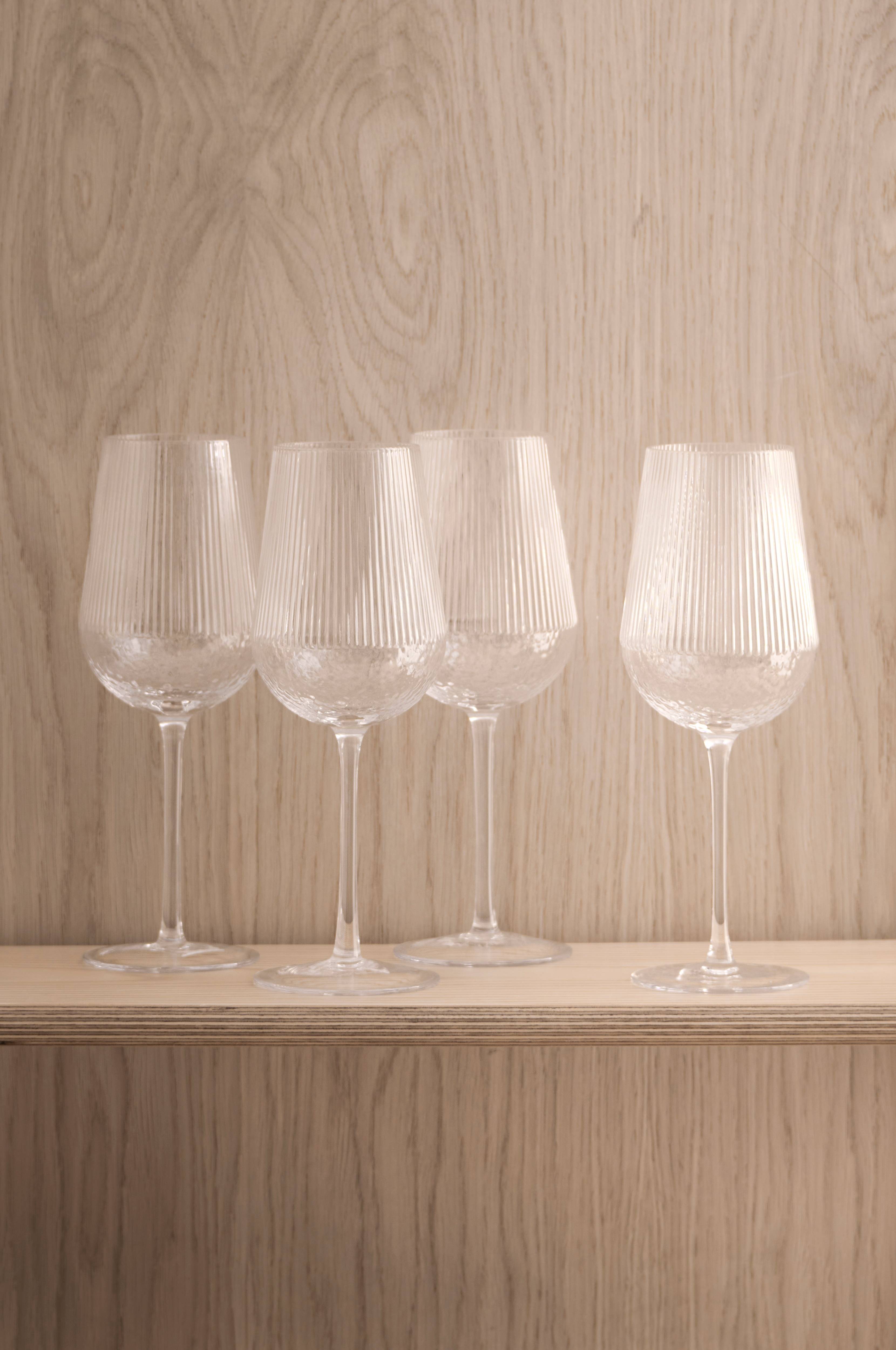 4 stk. vinglas. Højde 23,5 cm. Diameter foroven 6,5 cm. Diameter fod 8 cm. Volumen: 460 ml. Tåler opvaskemaskine men ikke mikrobølgeovn.