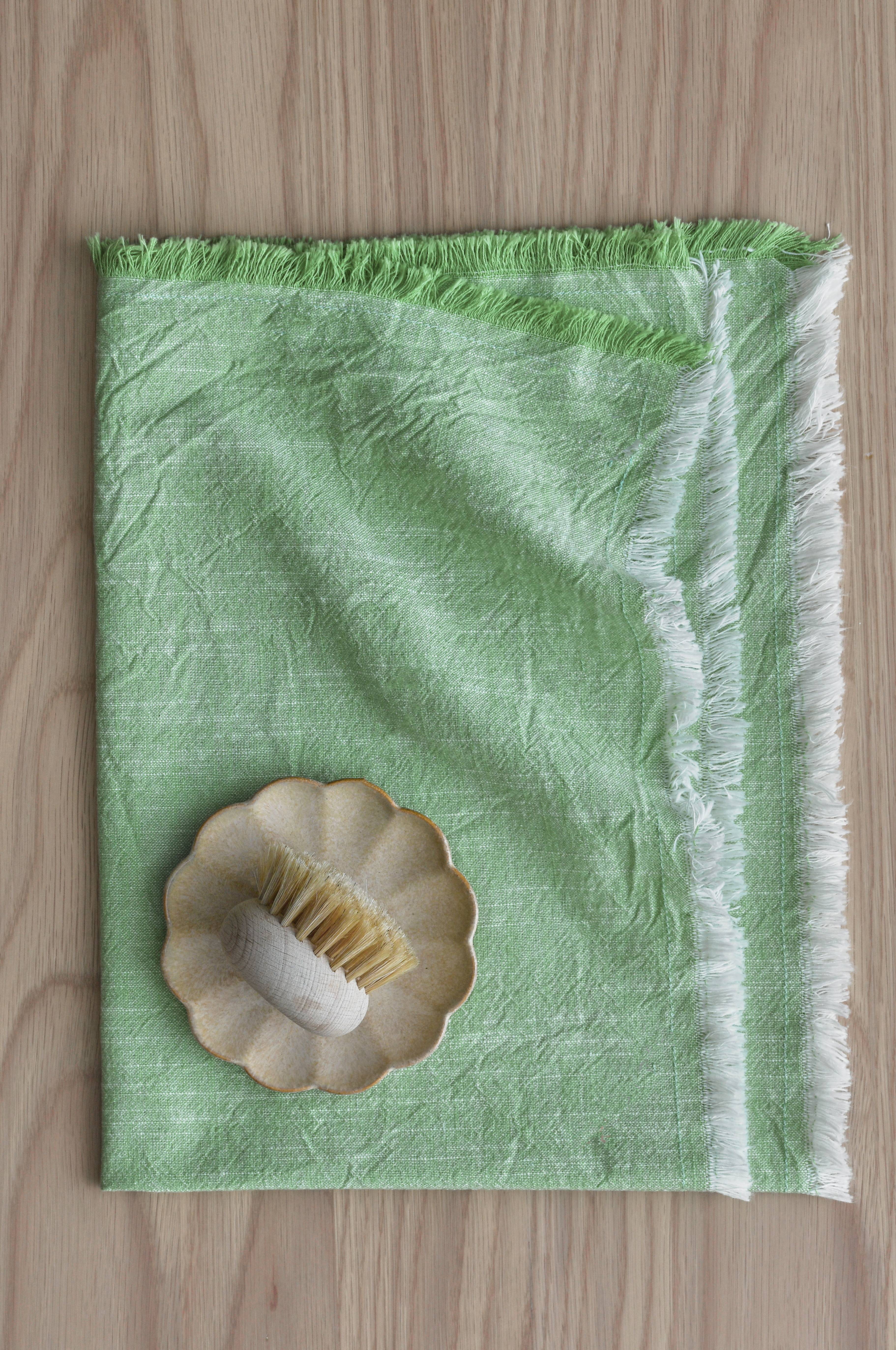 Viskestykke i vævet, økologisk bomuld med meleret farve og slubeffekt, hvilket betyder at stoffet har en let struktur. Frynser på 3 sider.