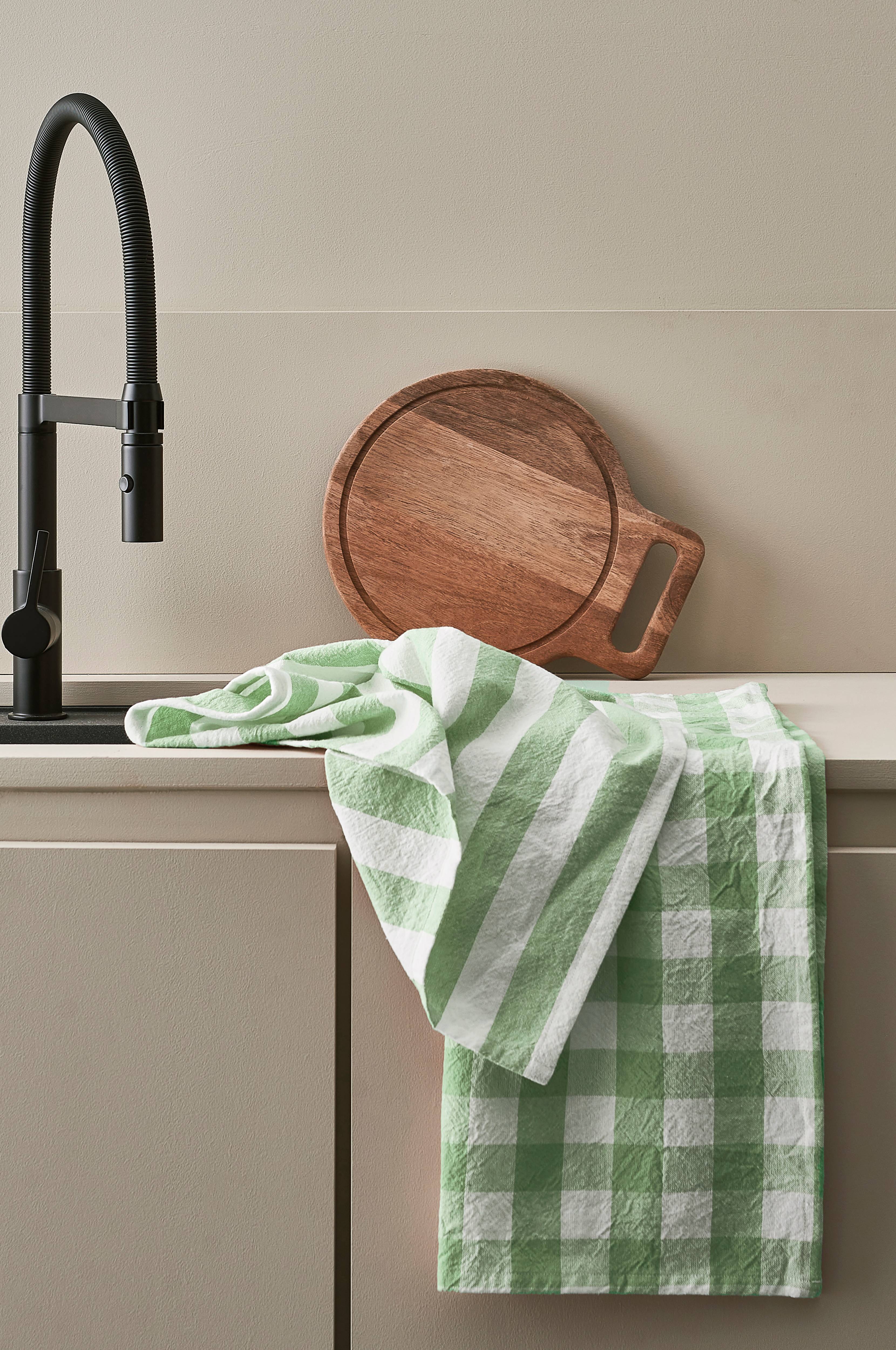 To viskestykker i økologisk bomuld, et med vævede tern og et med vævede striber.