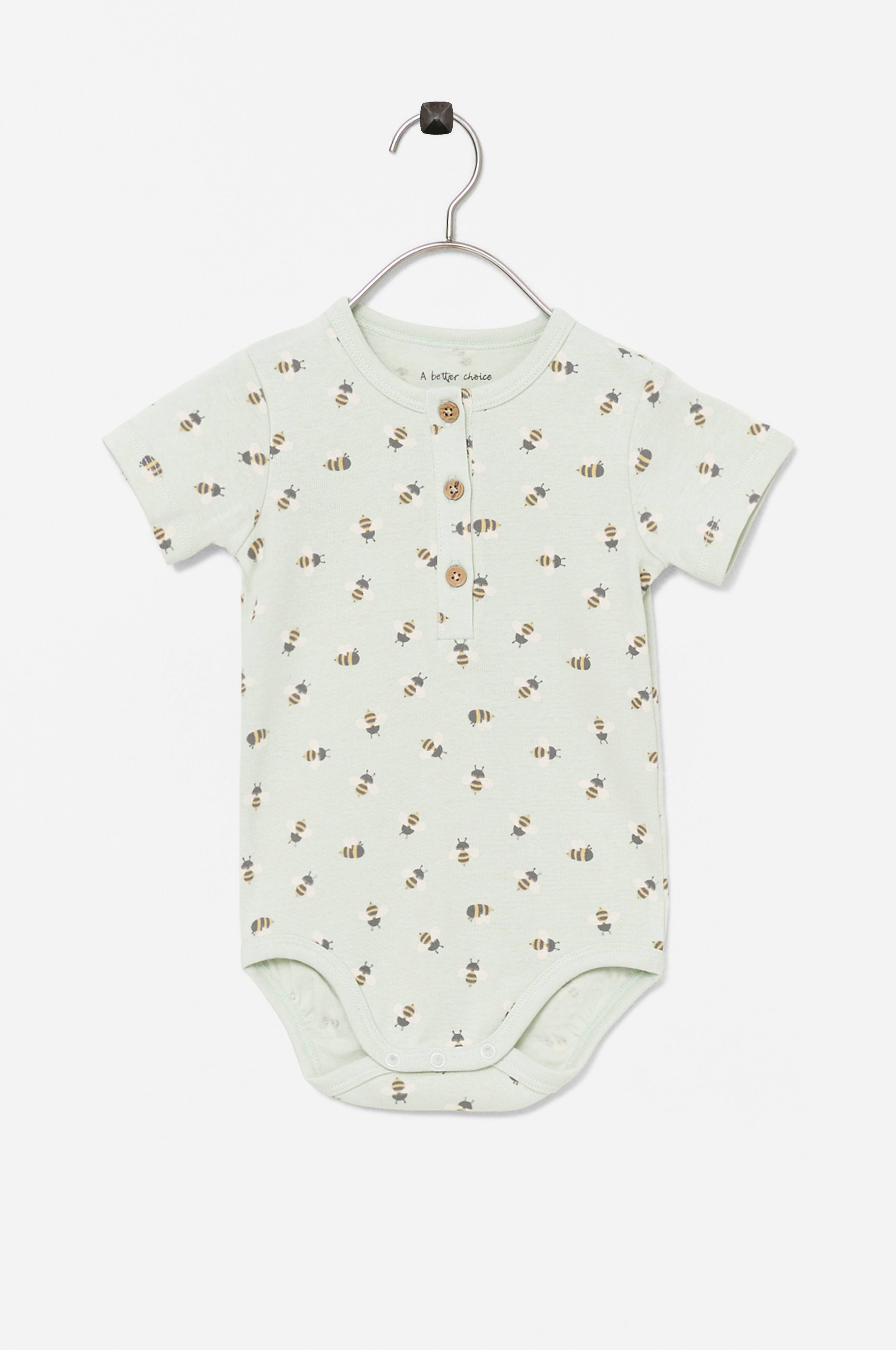 Kortærmet model i blød jersey med rund hals som har ribstrikket kantbånd og kort stolpelukning på brystet. Ribstrikket kantbånd i benene og trykknapper i skridtet.