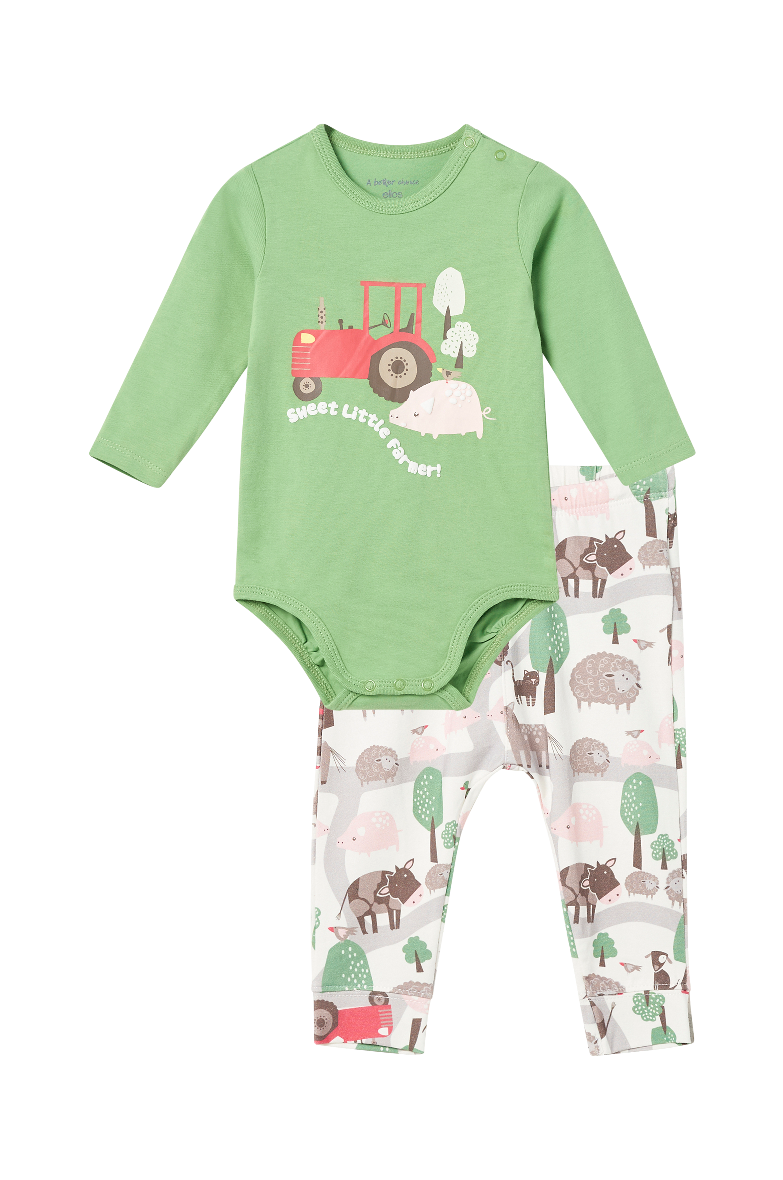 • Todelt sæt i bomuldsjersey • Langærmet body • Trykknapper på en skulder og ved skridtet • Bukser med træksnørre ved taljen • Produktet indeholder økologisk bomuld, som er dyrket uden kemiske sprøjtemidler, kunstgødning og genmodificerede afgrøder (GMO). Dette betyder et sundere arbejdsmiljø for landmænd og bedre jord.