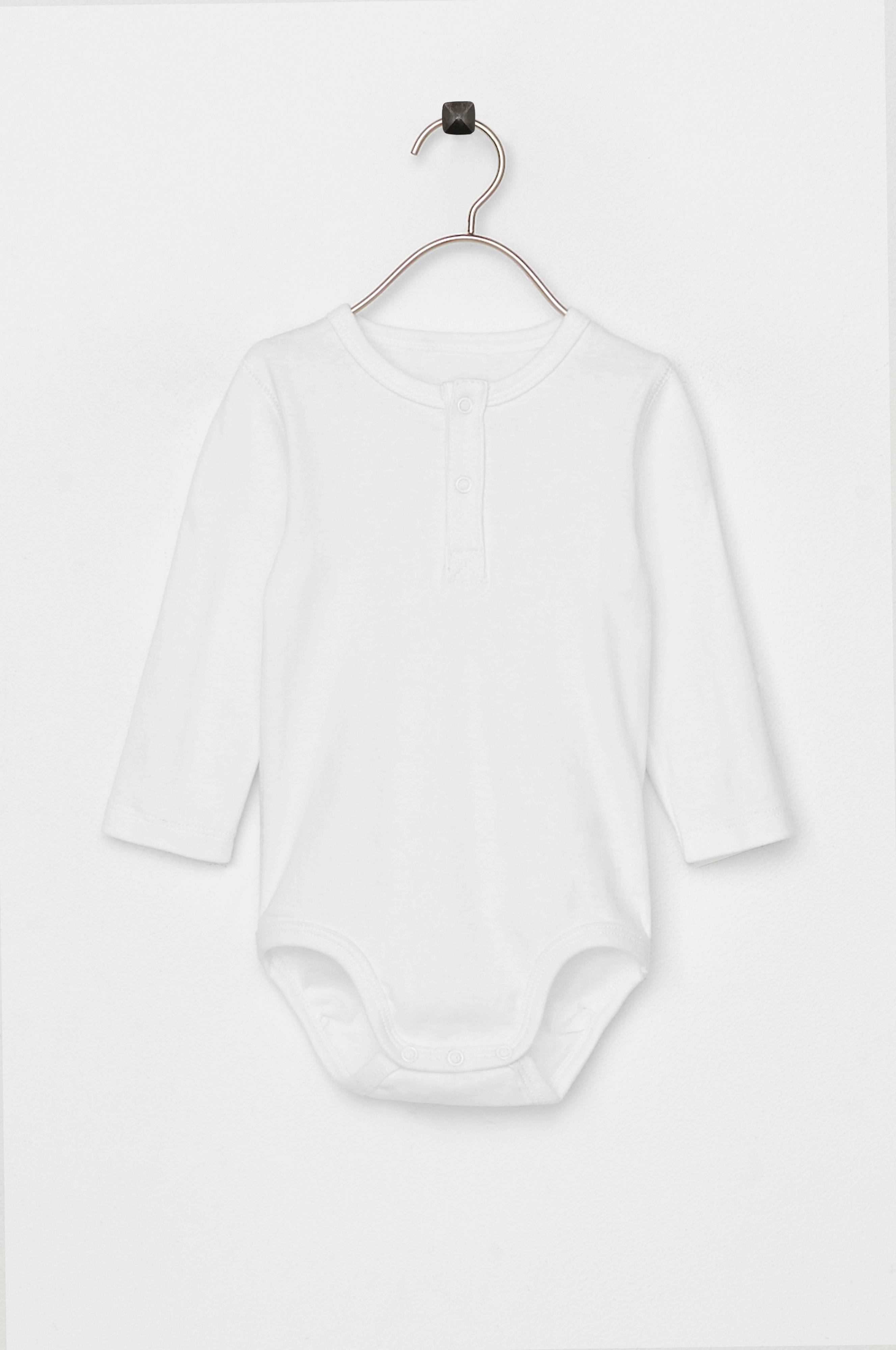 Body Button i jersey af fin, økologisk bomuld. Langærmet model med rund hals, som har ribstrikket kantbånd samt stolpelukning med trykknapper. Også ribstrikket kantbånd i benudskæring samt trykknapper i skridtet.