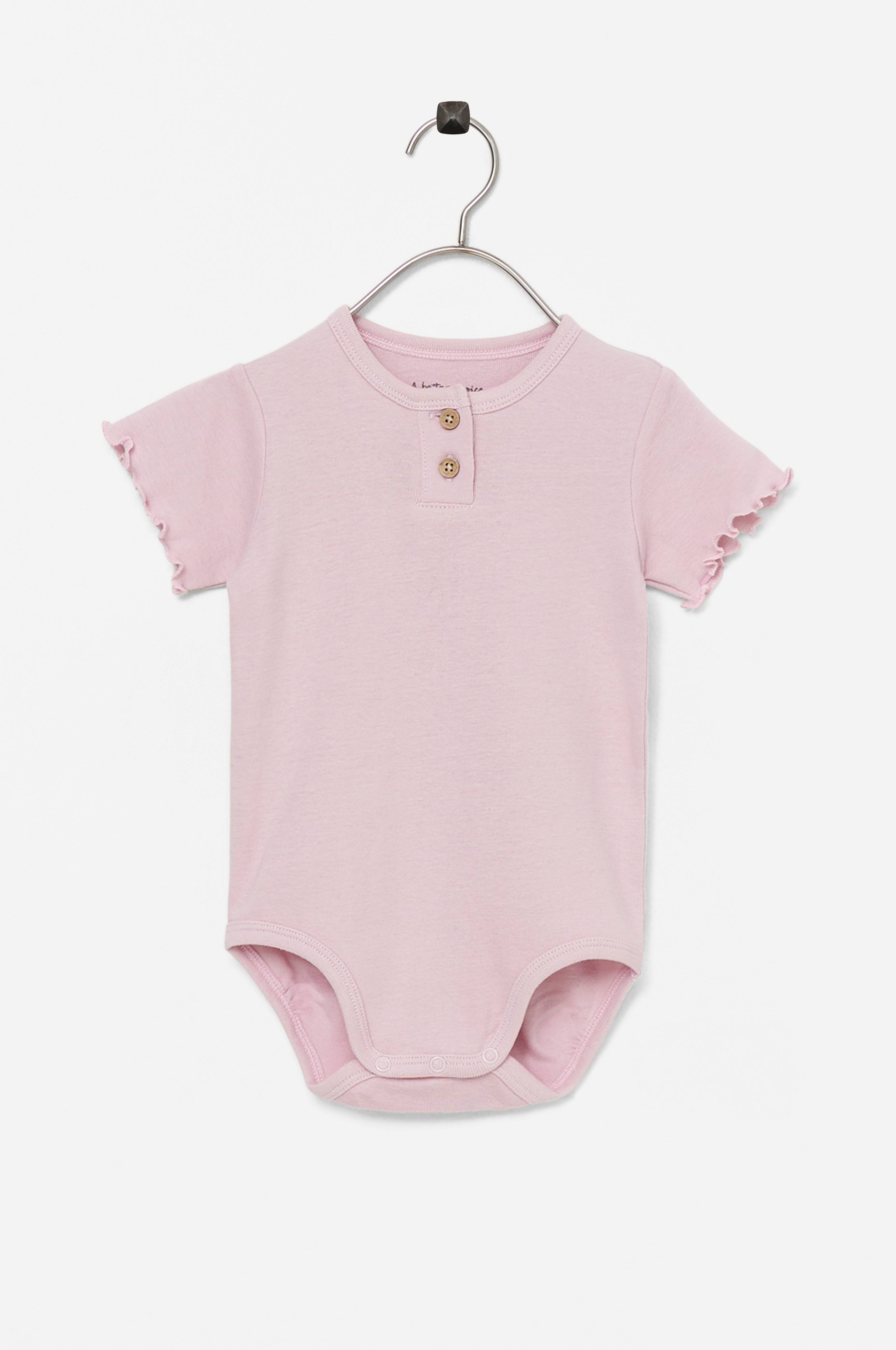 Model med kort ærme som har klokkeformet ærmekant. Rund hals med kantbånd og kort stolpelukning. Kantbånd rundt om benene samt trykknapper i skridtet.