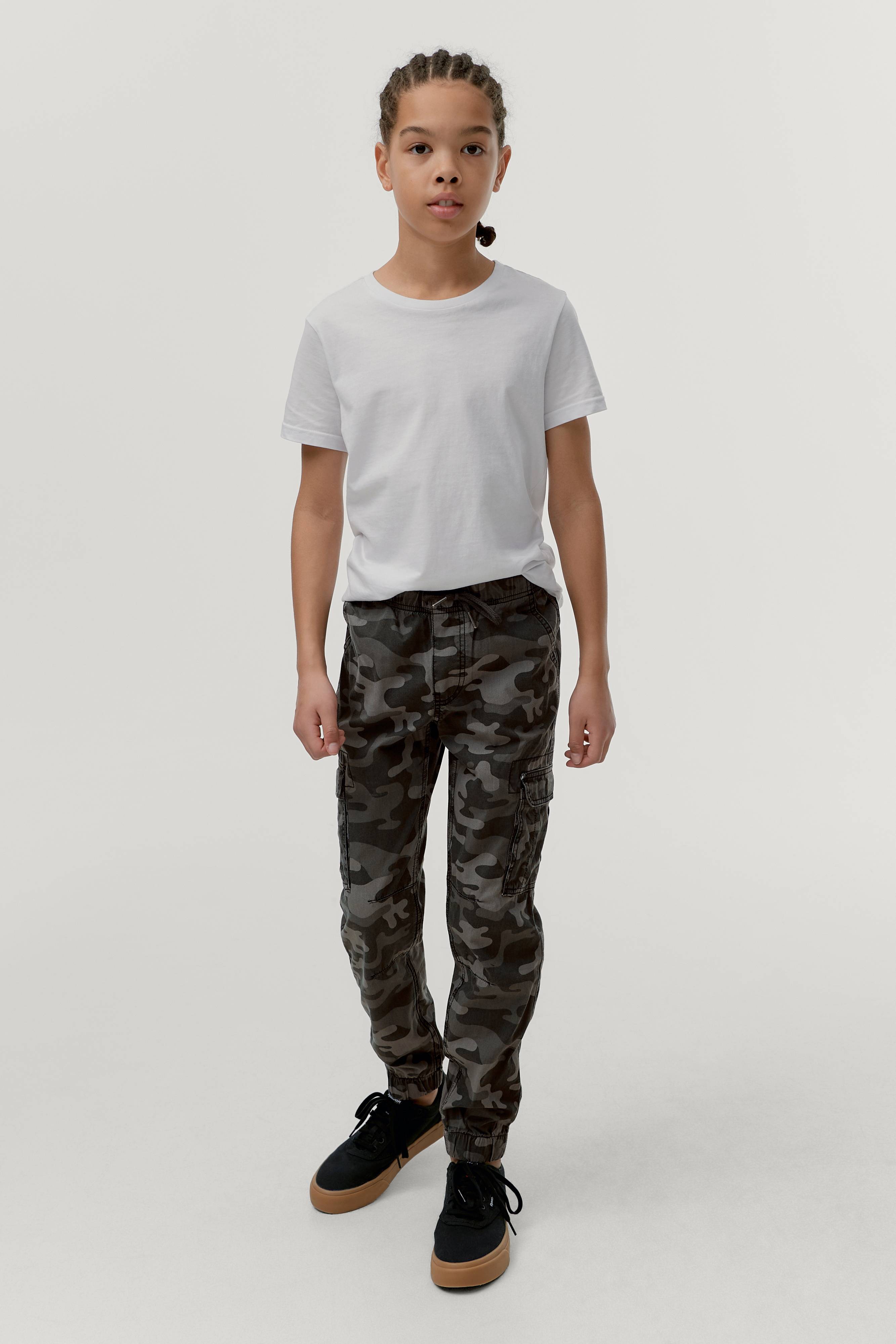 Cargobukser i vævet, blødvasket kvalitet af bomuld. Elastisk linning med løbegang. To lommer foran og to baglommer med klap. To benlommer med klap som kan lukkes med velcro. Elastik i benkanten.
