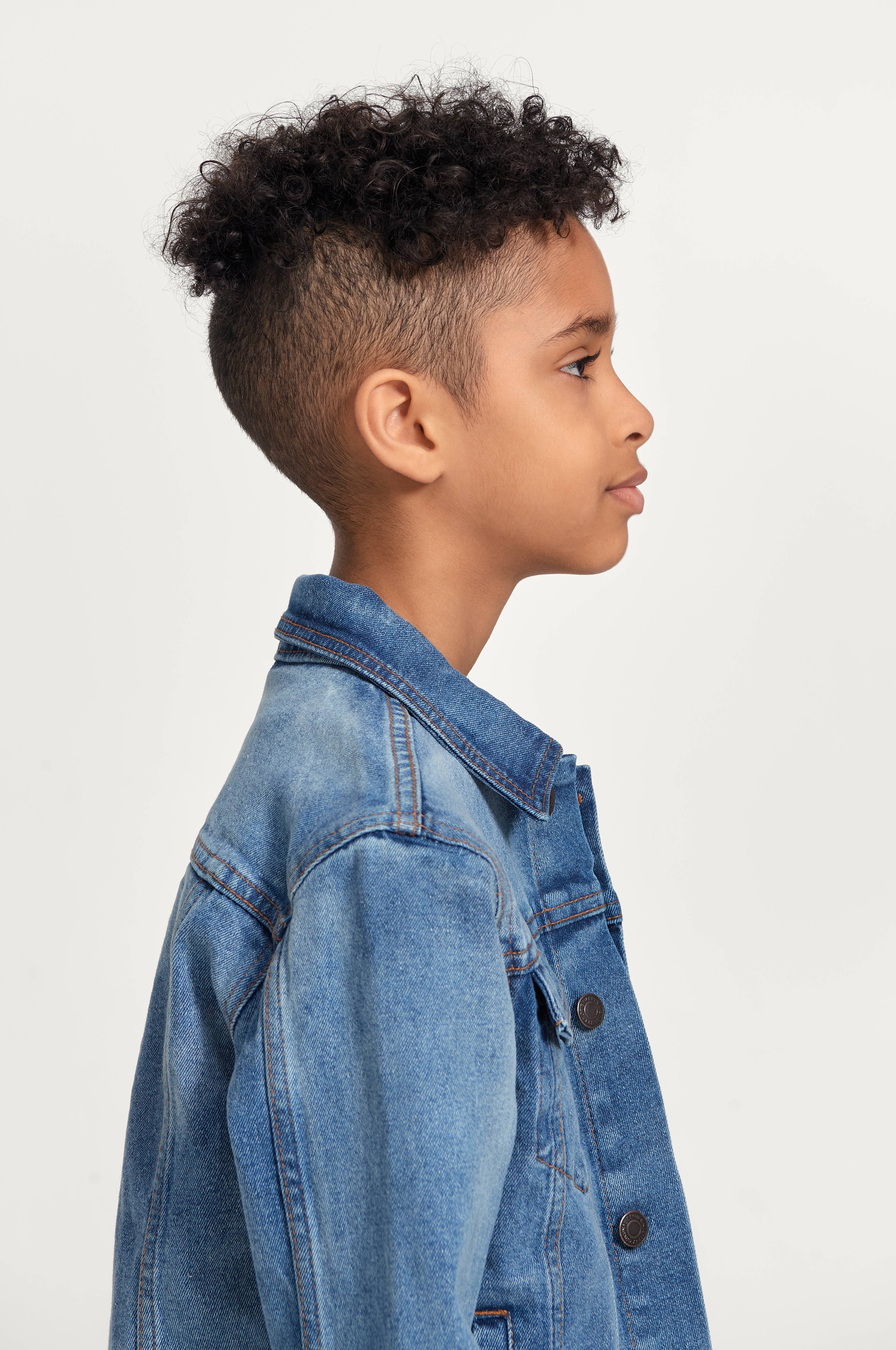 Denimjakke i stretchdenim med prægede metalknapper. To sidelommer og to brystlommer med klap, som kan knappes. Slids og knap i ærmekant.