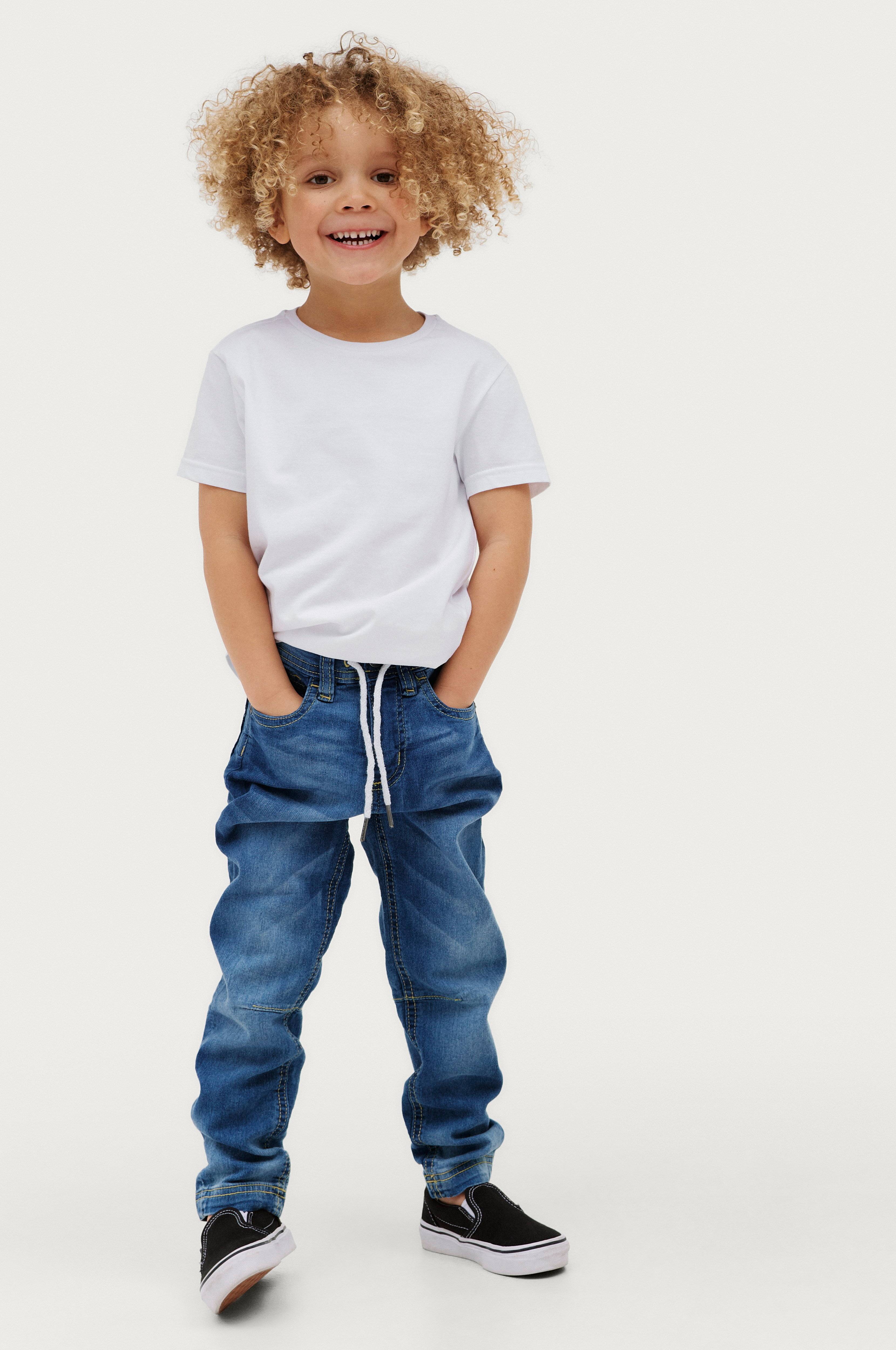 Denimjoggers i blød, skøn stretchkvalitet. 5-lommemodel med lynlåsgylp, trykknap og justerbar løbegang i taljen. Syede læg ved knæene og let smal pasform.