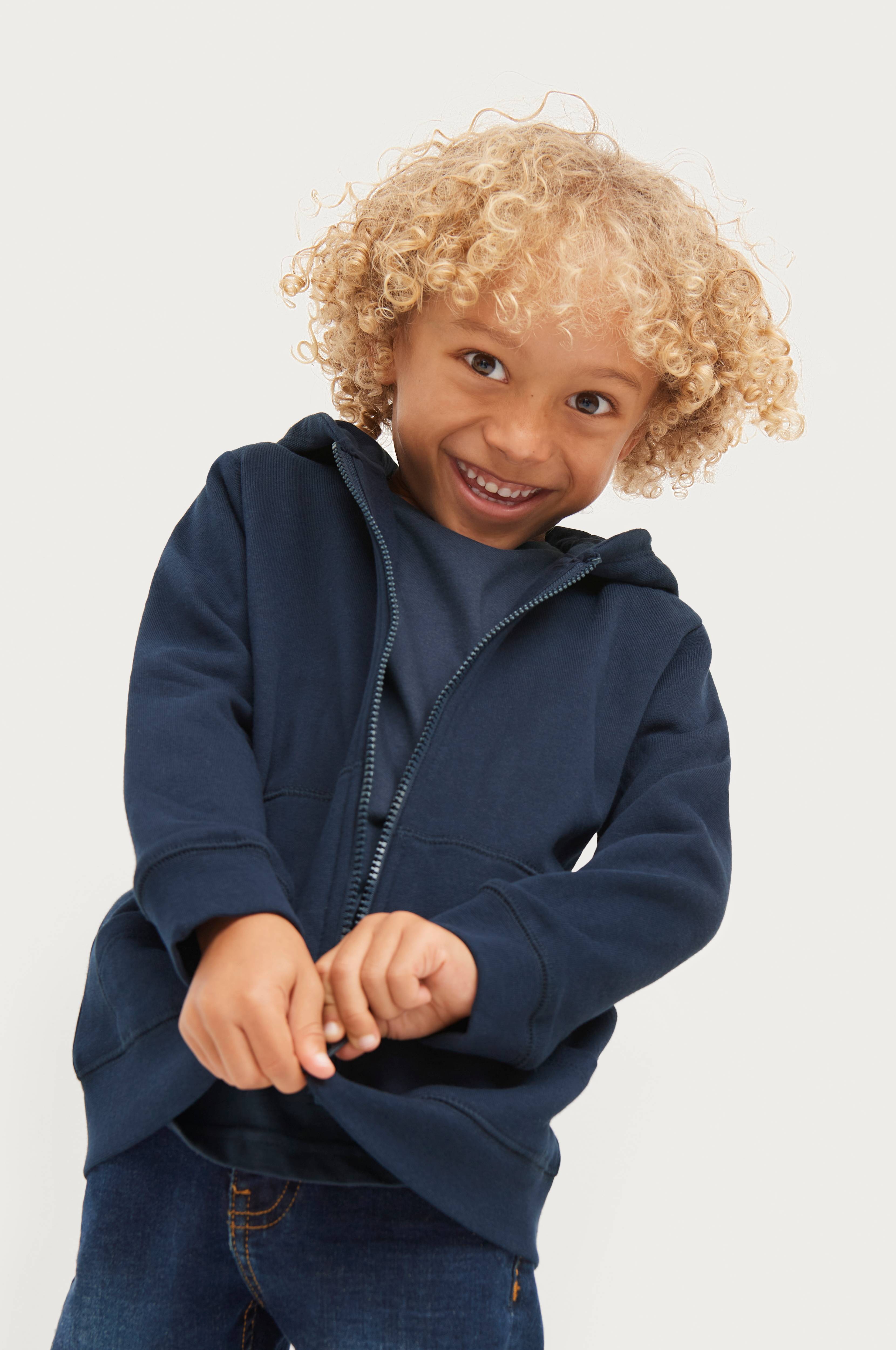 Hættetrøje af bomuld med blød, børstet inderside. Ribkant i ærmekanten og kanten forneden. Lomme foran og foret hætte.