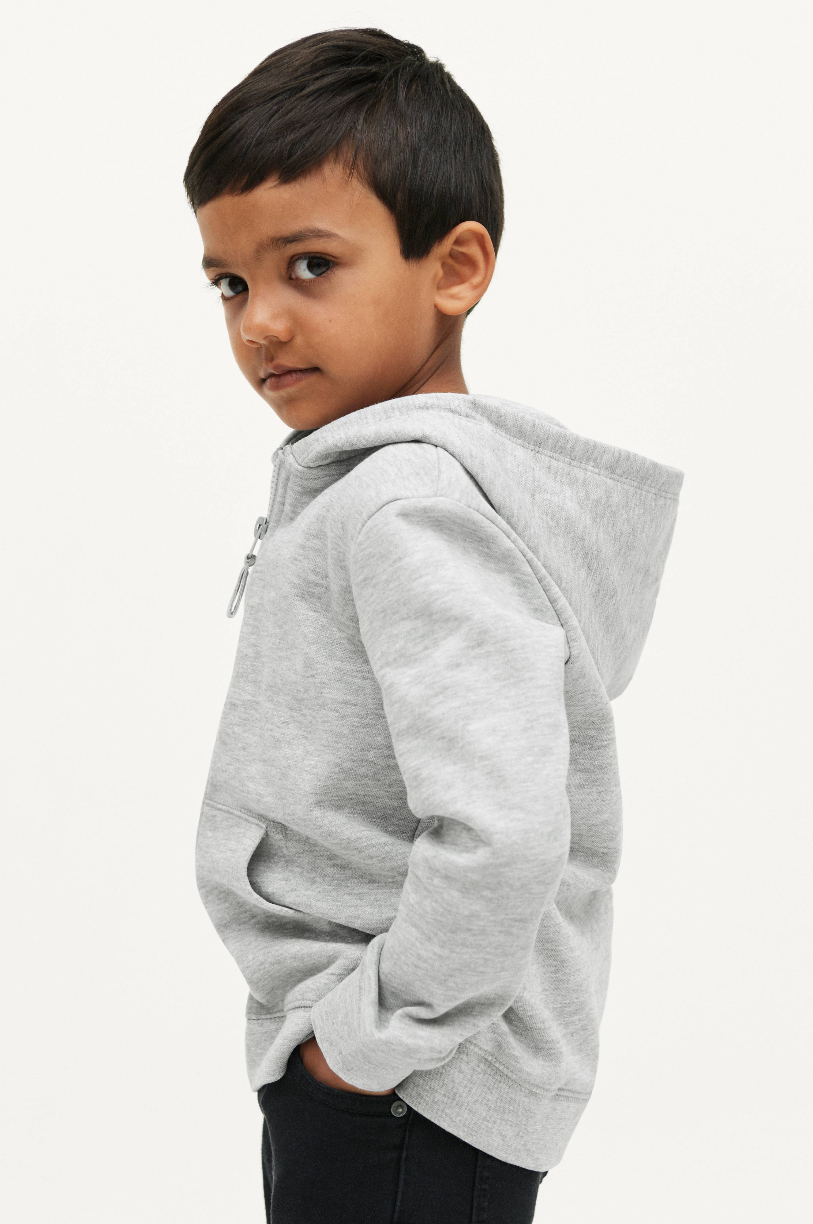 Hættetrøje af bomuld med blød, børstet inderside. Ribkant i ærmekanten og kanten forneden. Lomme foran og foret hætte.