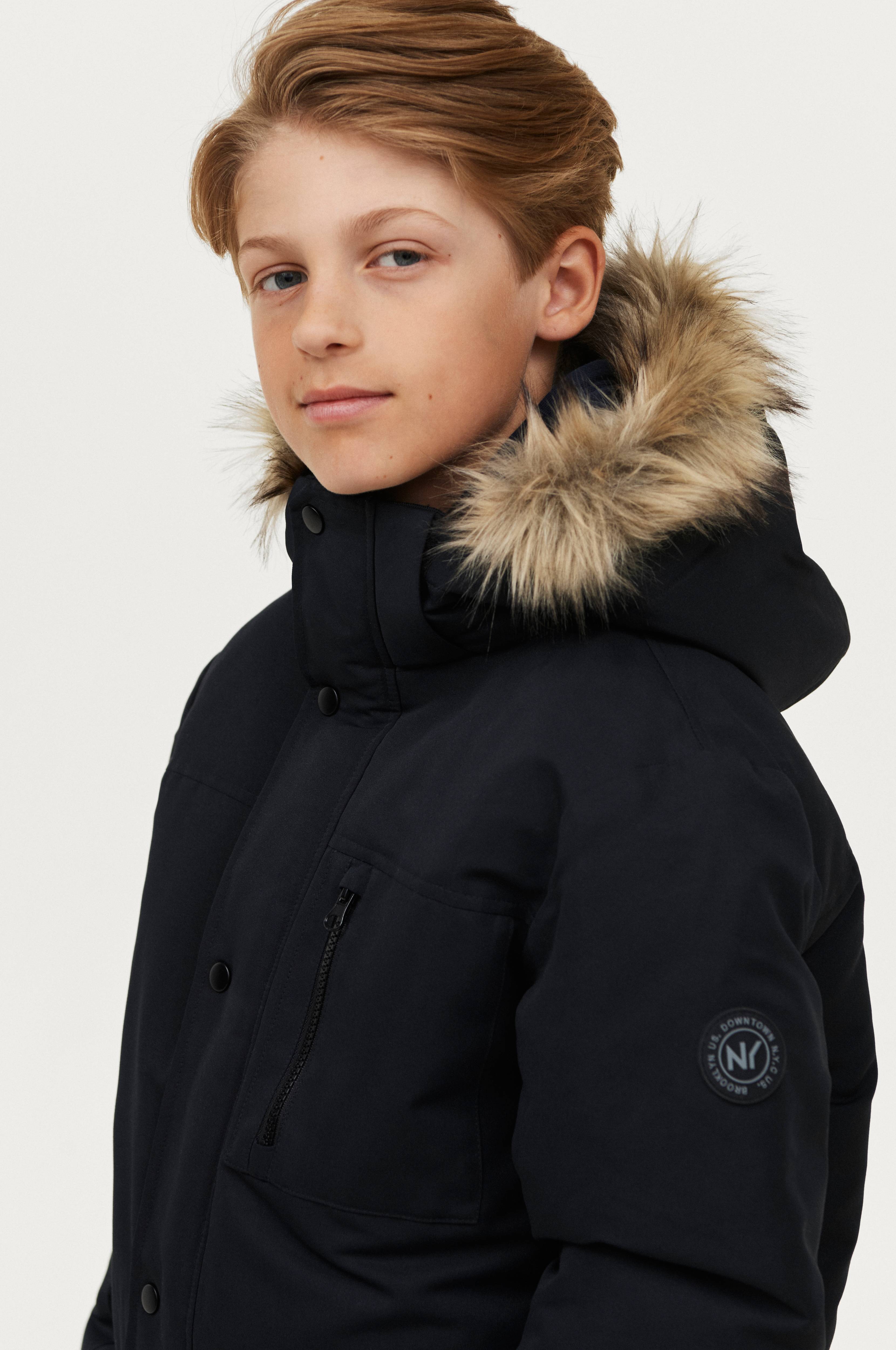 Vatteret jakke med aftagelig hætte. Hætten har en aftagelig kant i kunstpels. Høj krave med ribstrikket inderside. Lynlås og overfald med trykknapper. Rib i ærmekanterne. To yderlommer med velcrolukning og en brystlomme med lynlås. En inderlomme med velcrolukning. Mærke i gummi på venstre ærme.