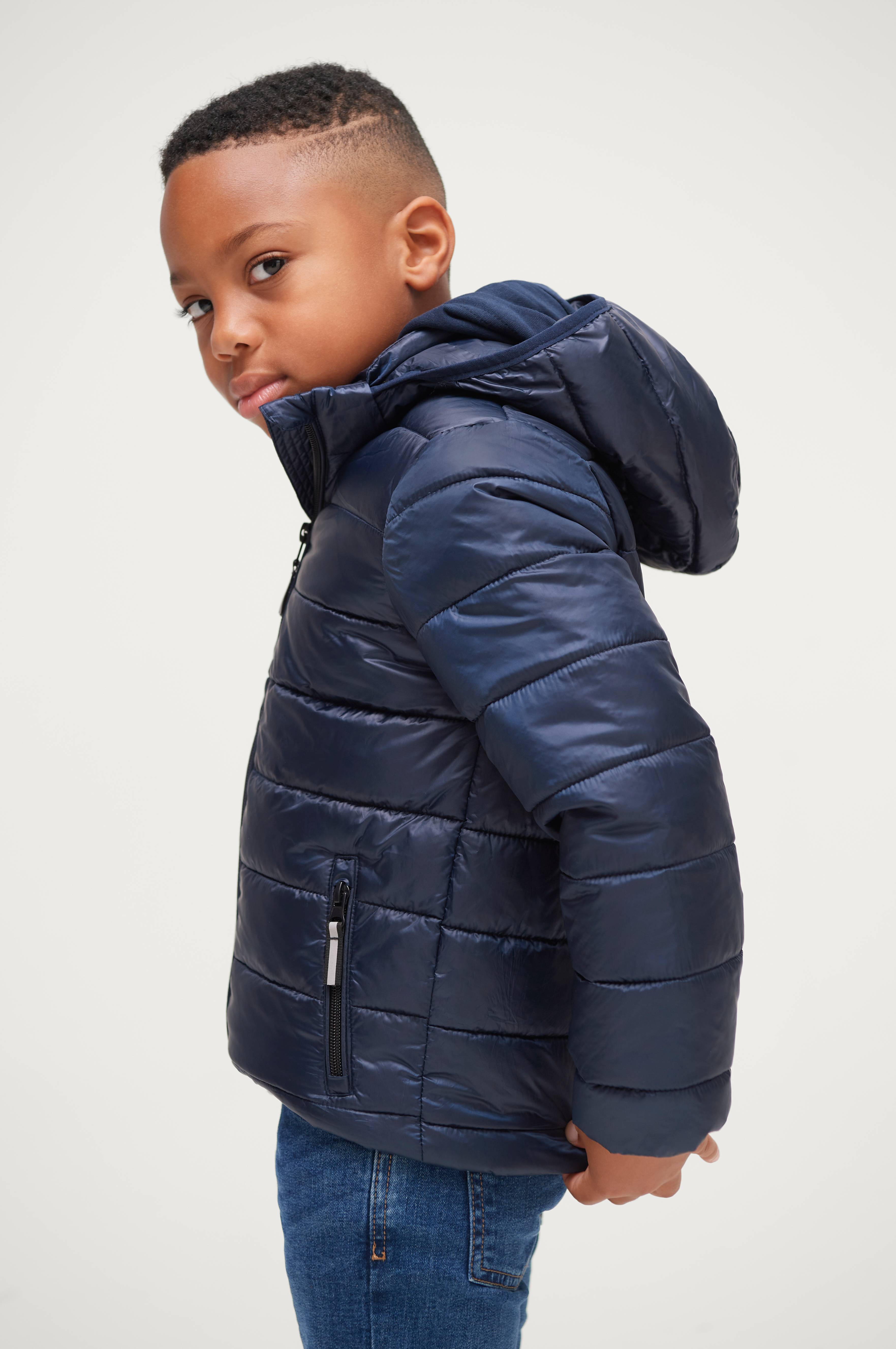 Quiltet og vatteret jakke med aftagelig hætte. Blødt fyld af polyester med dun-touch. Glat, vævet for. Lukning med lynlås. To lommer med lynlås. Elastiske kantbånd i hætte, ærmekant og kanten forneden. Refleksdetaljer foran.